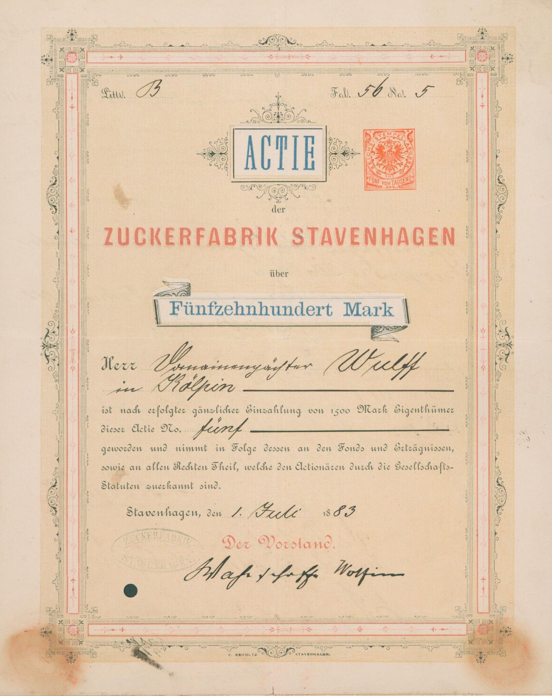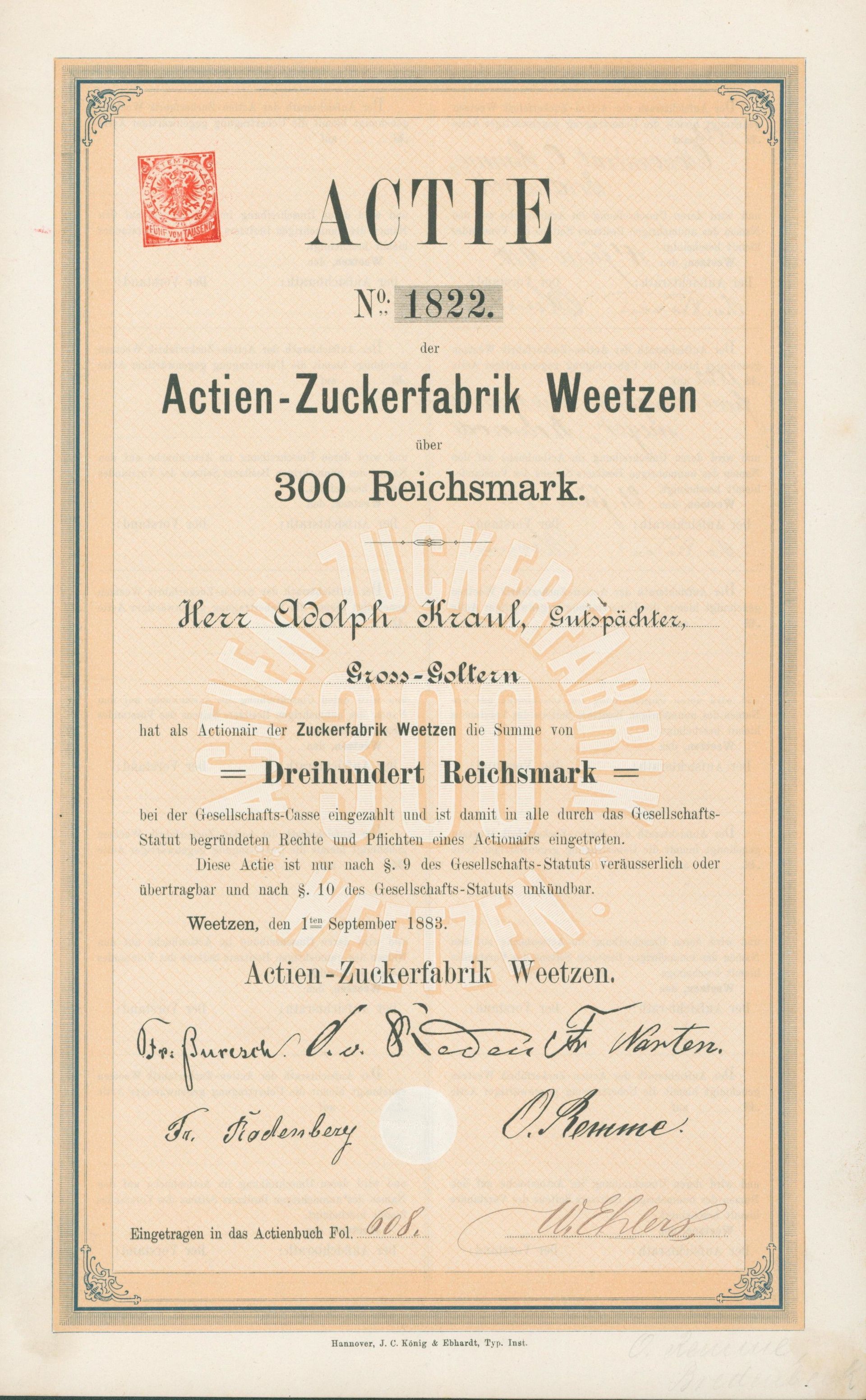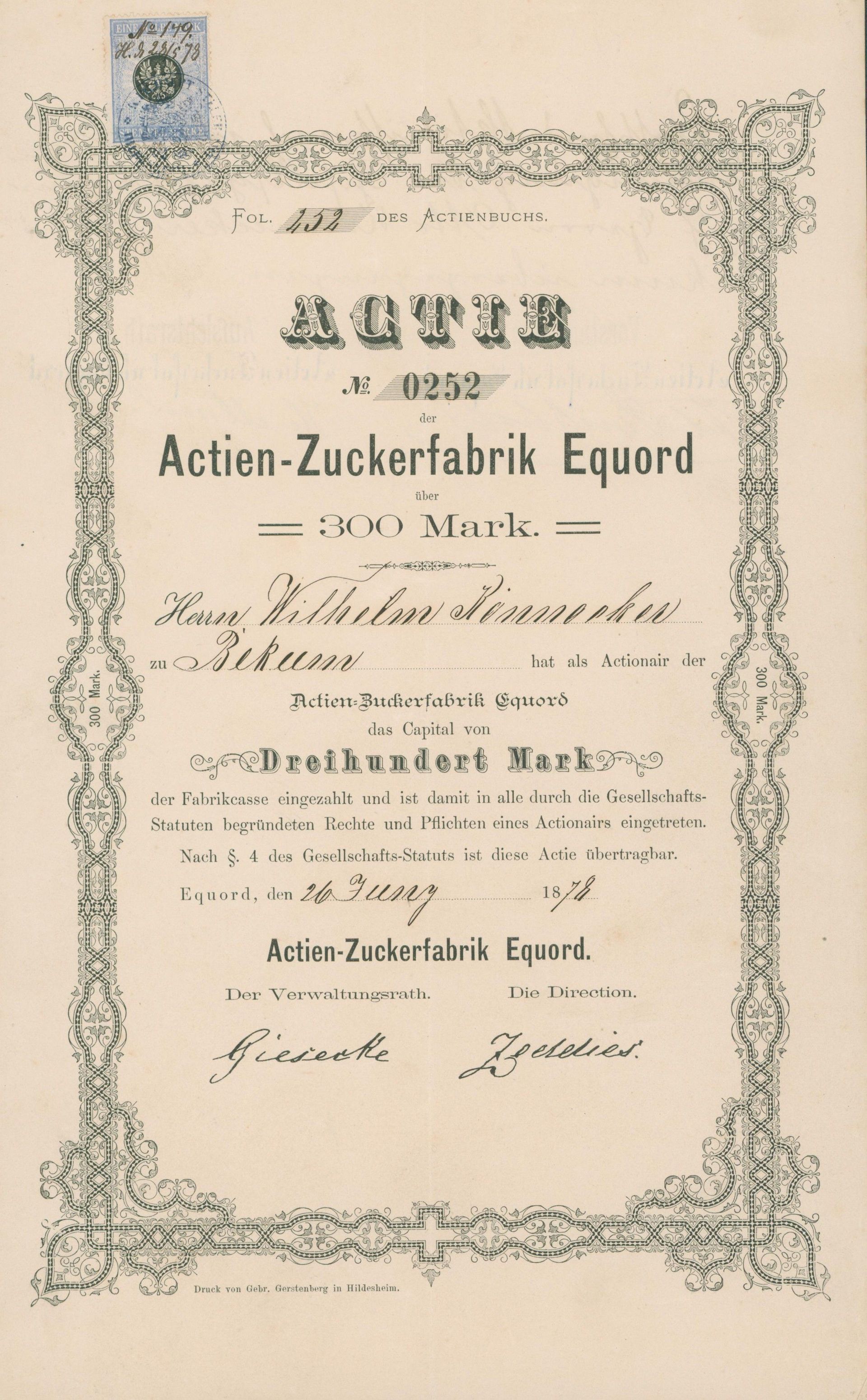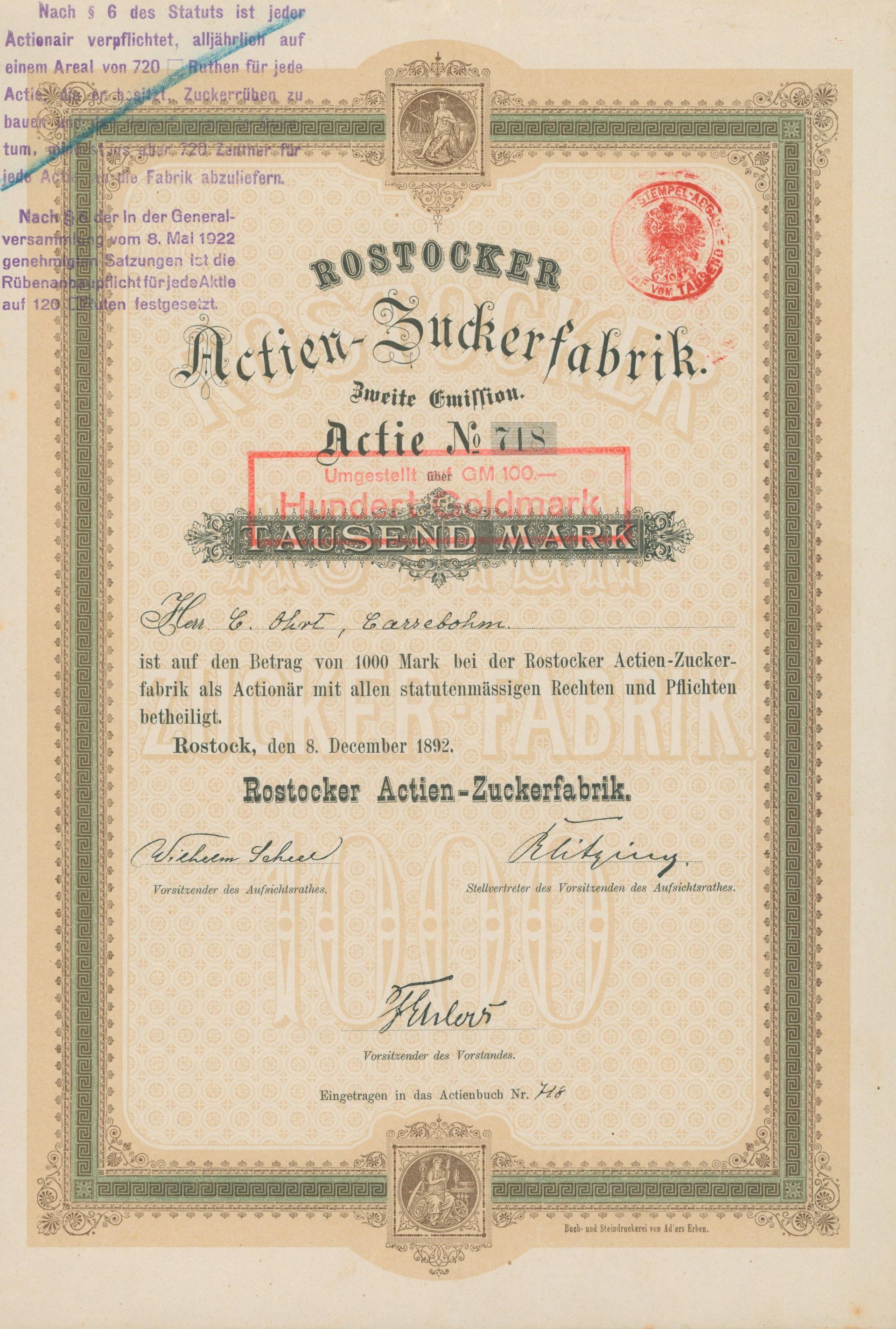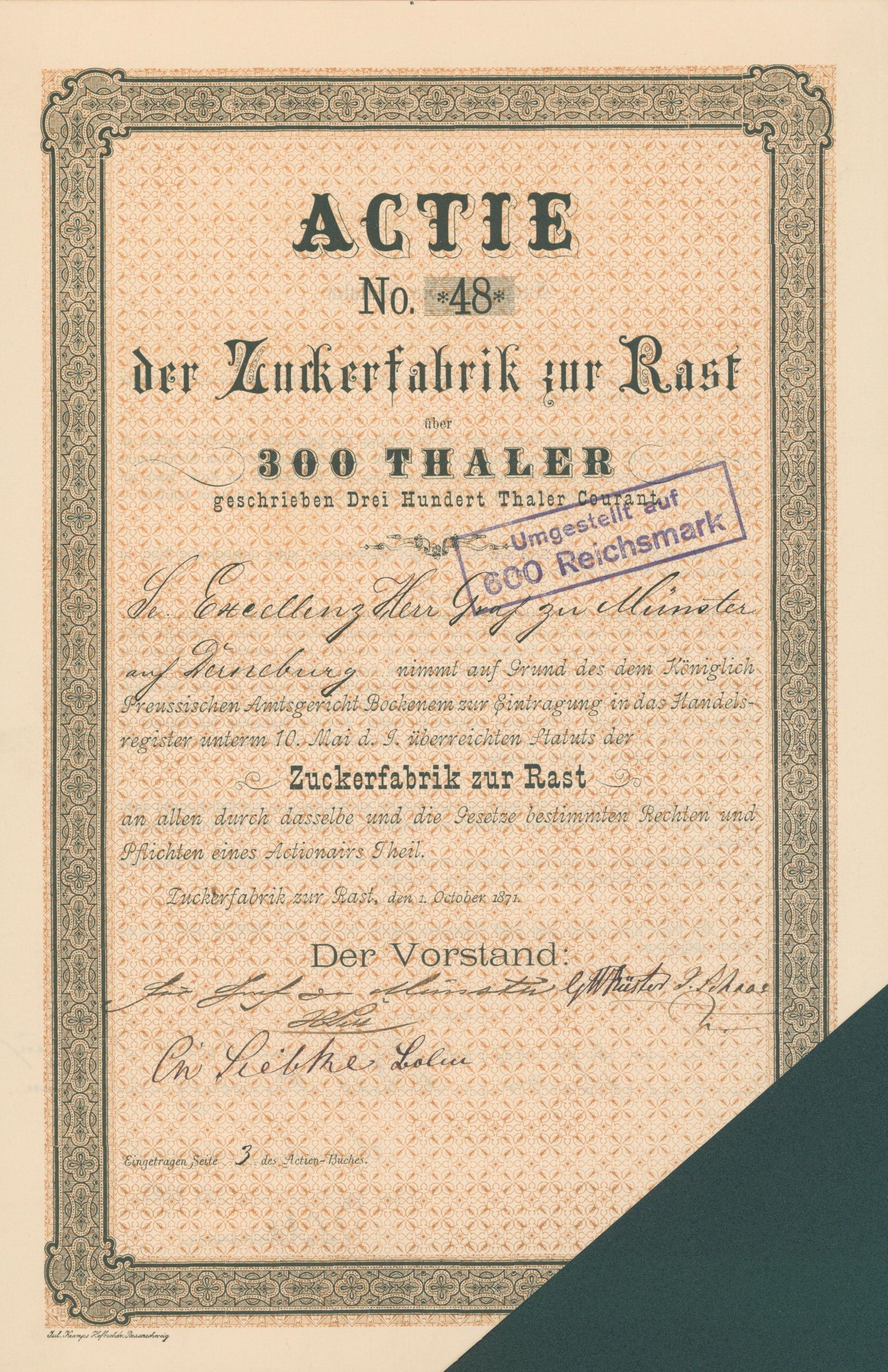 Die älteste bekannte deutsche Aktie aus der Zuckerindustrie - eine Raffinerie in Königsberg.