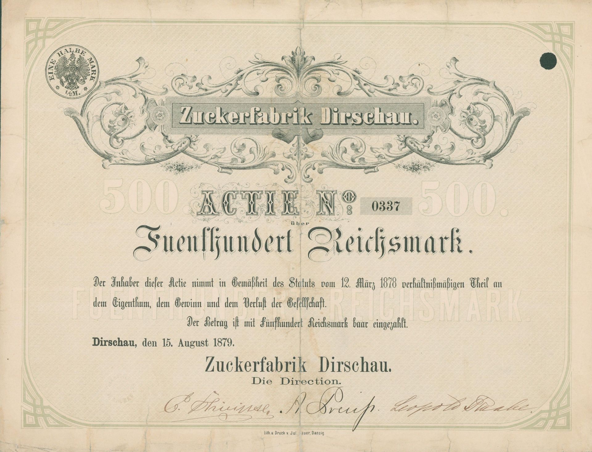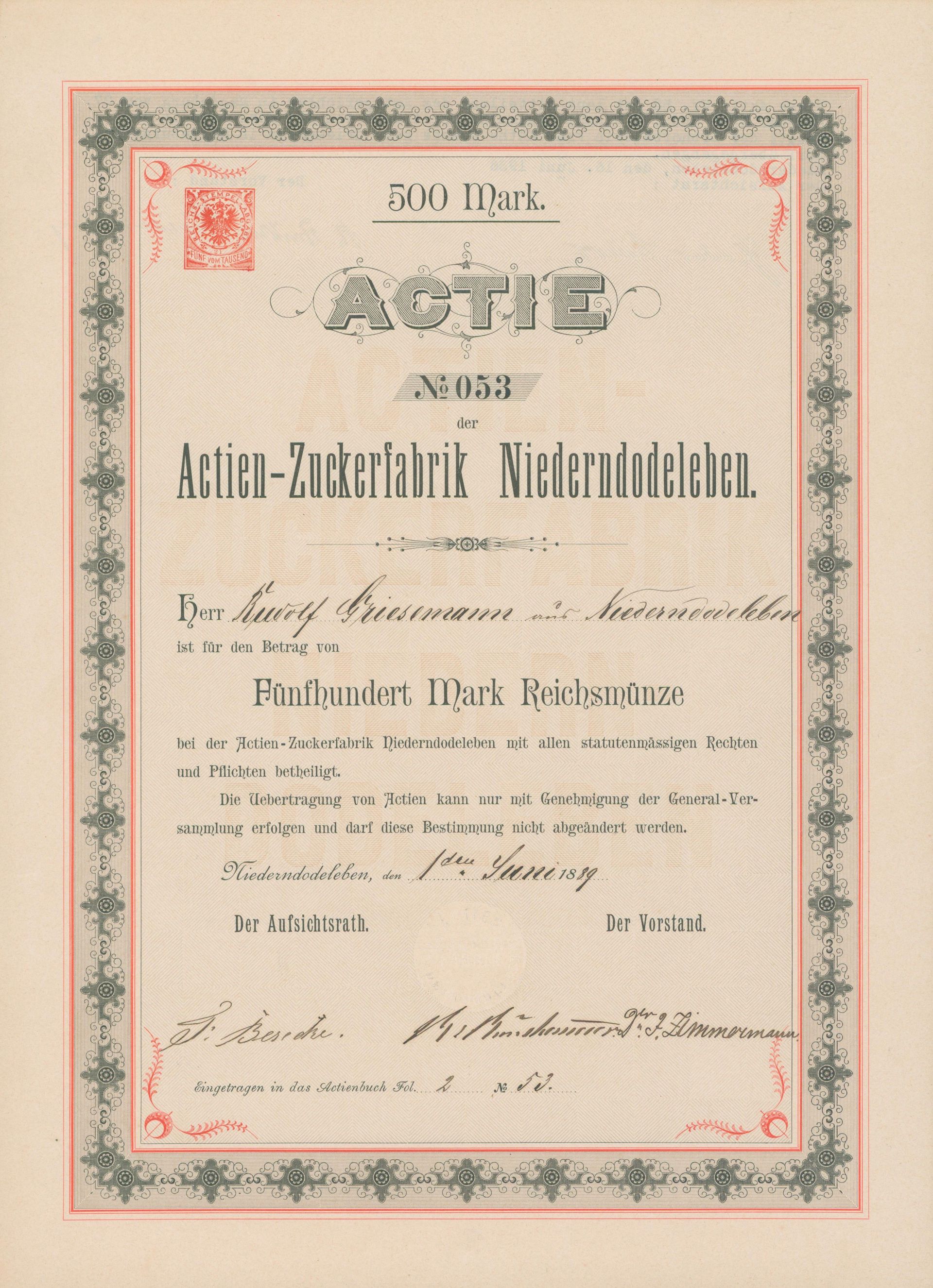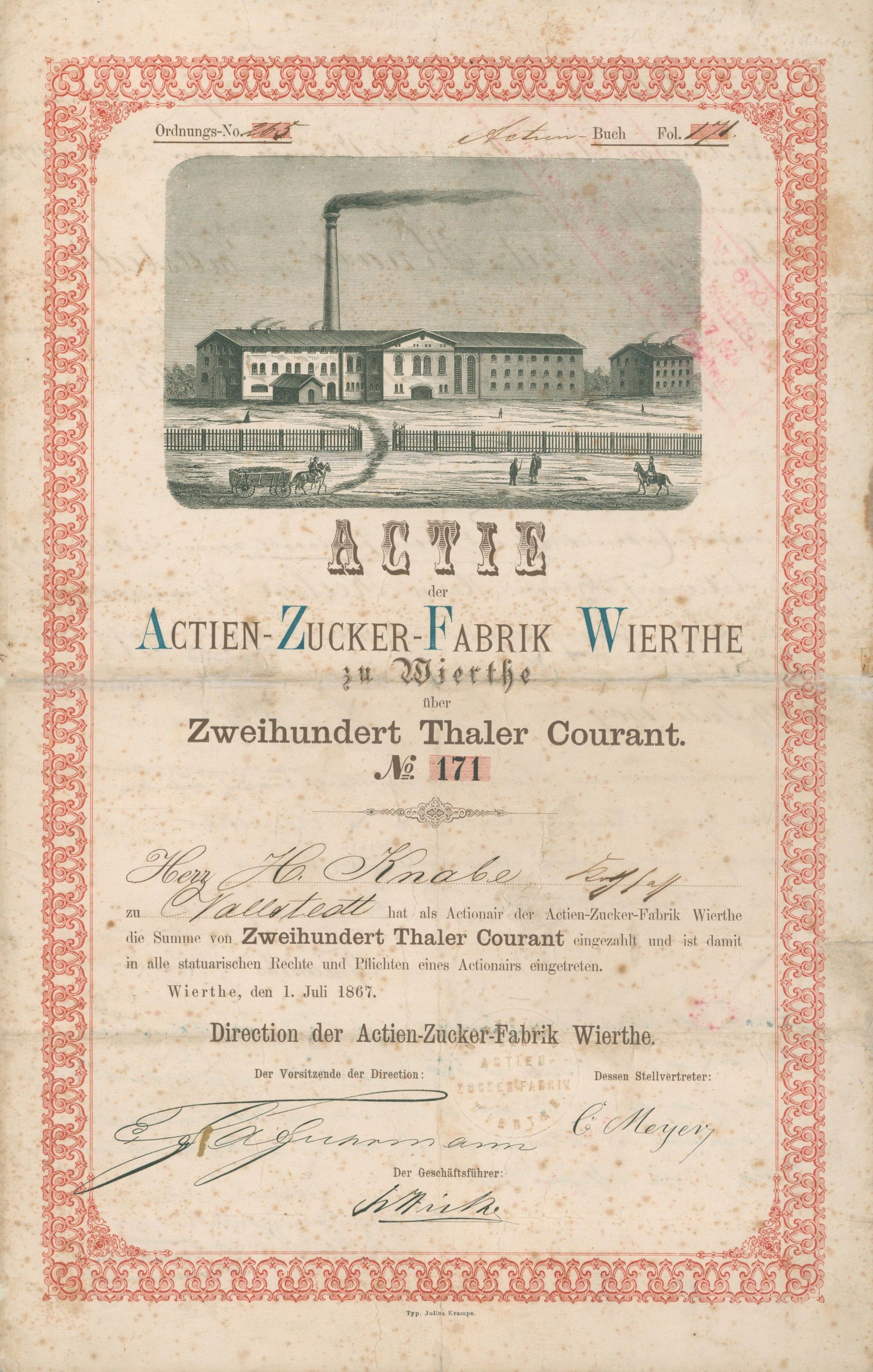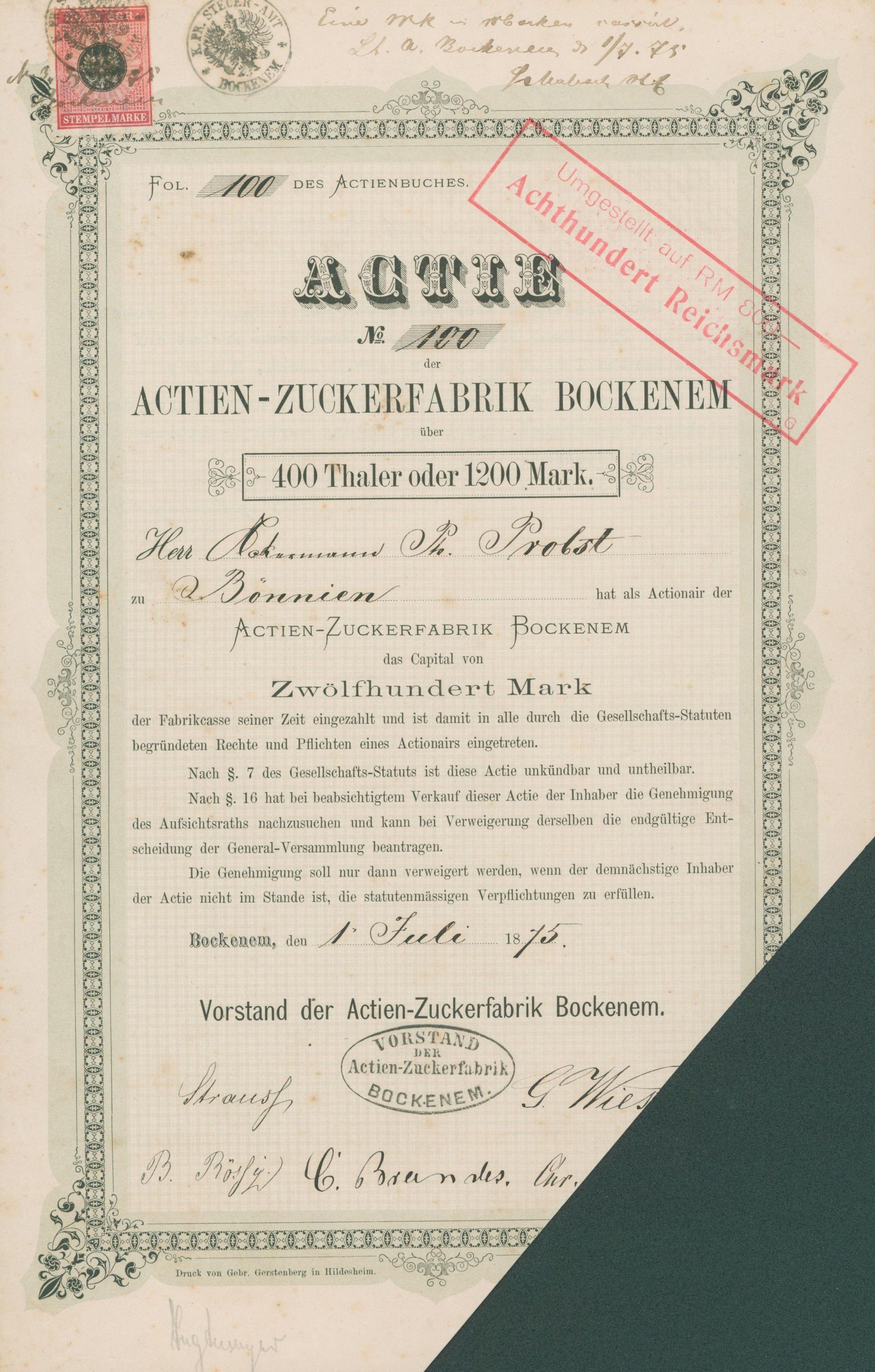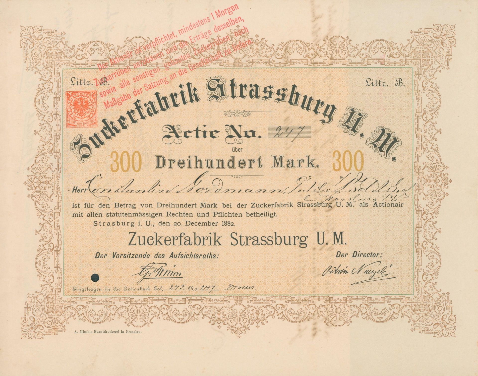 Die älteste bekannte deutsche Aktie aus der Zuckerindustrie - eine Raffinerie in Königsberg.