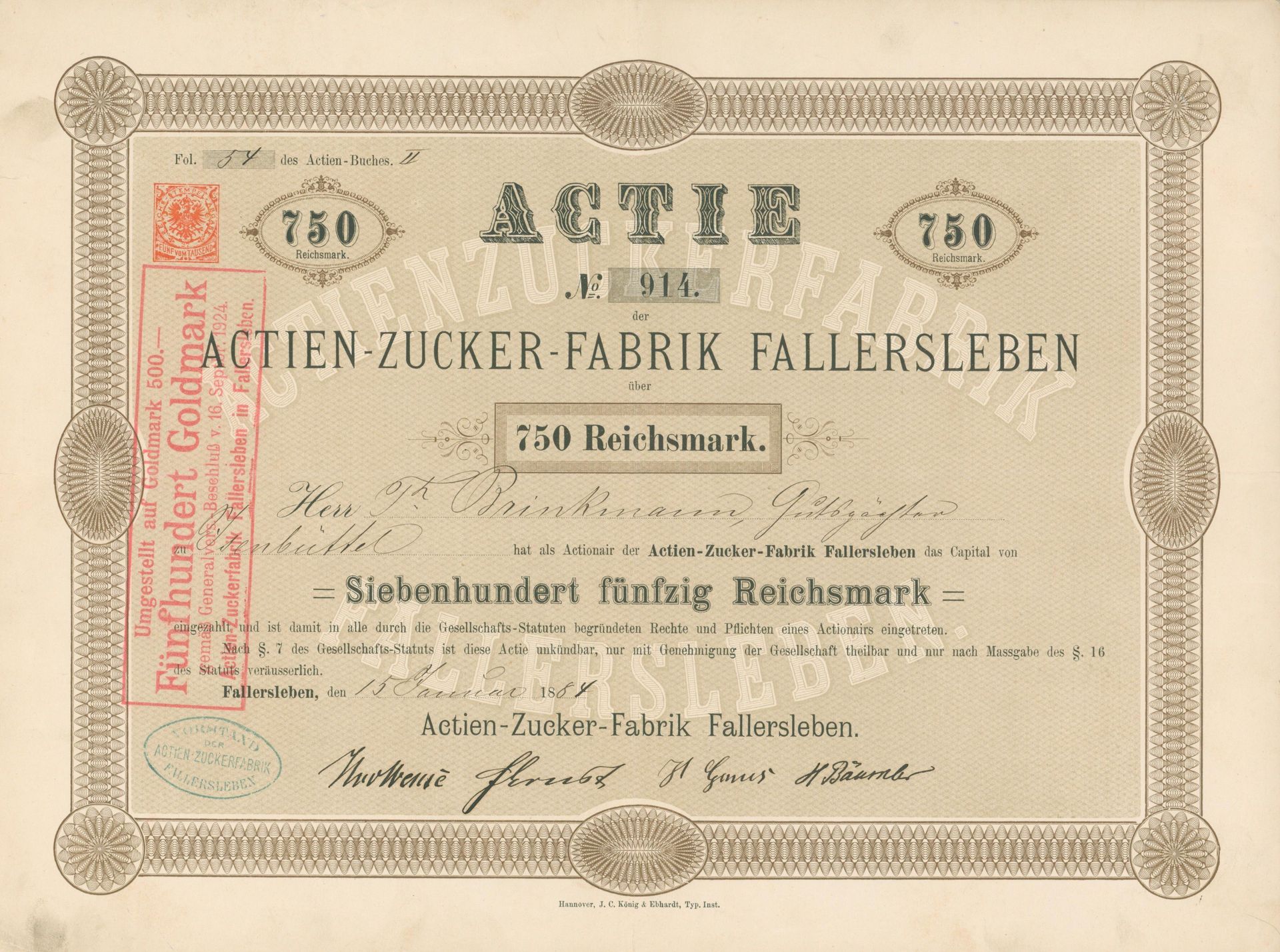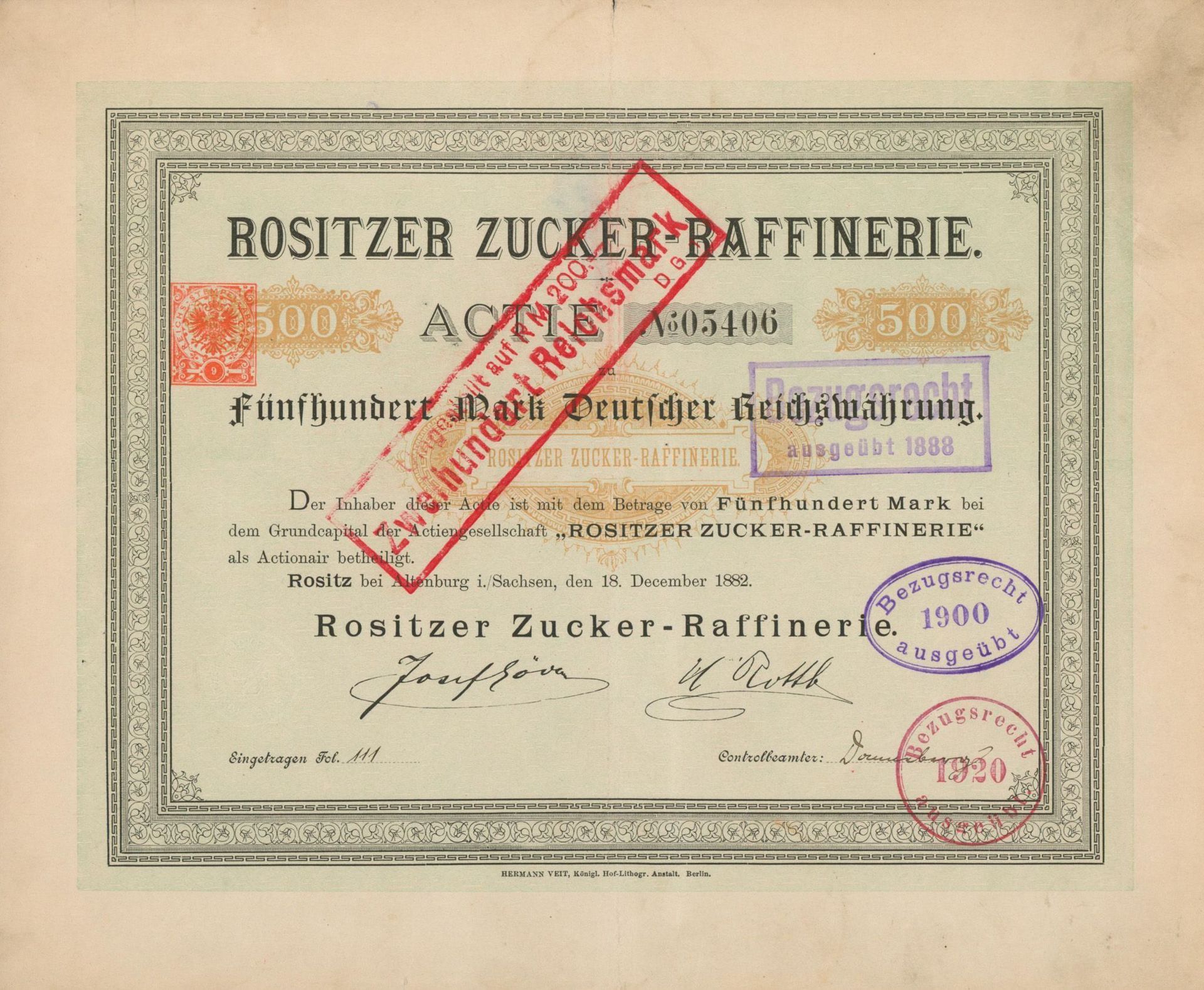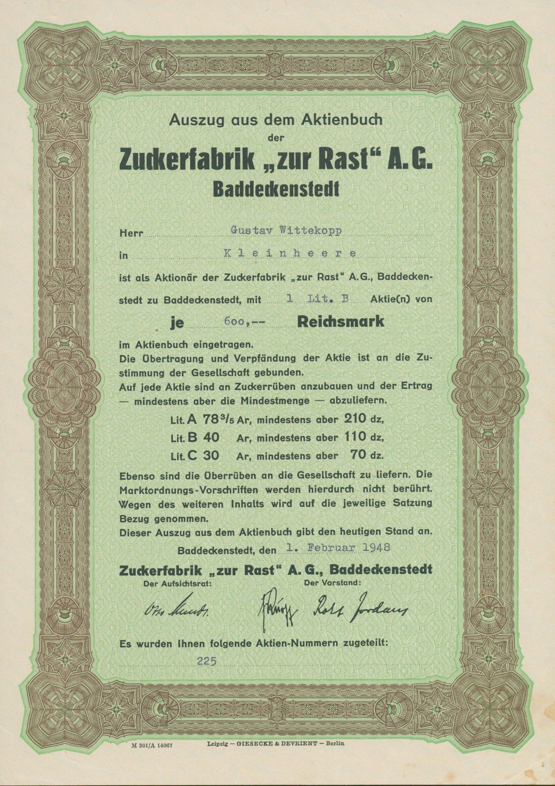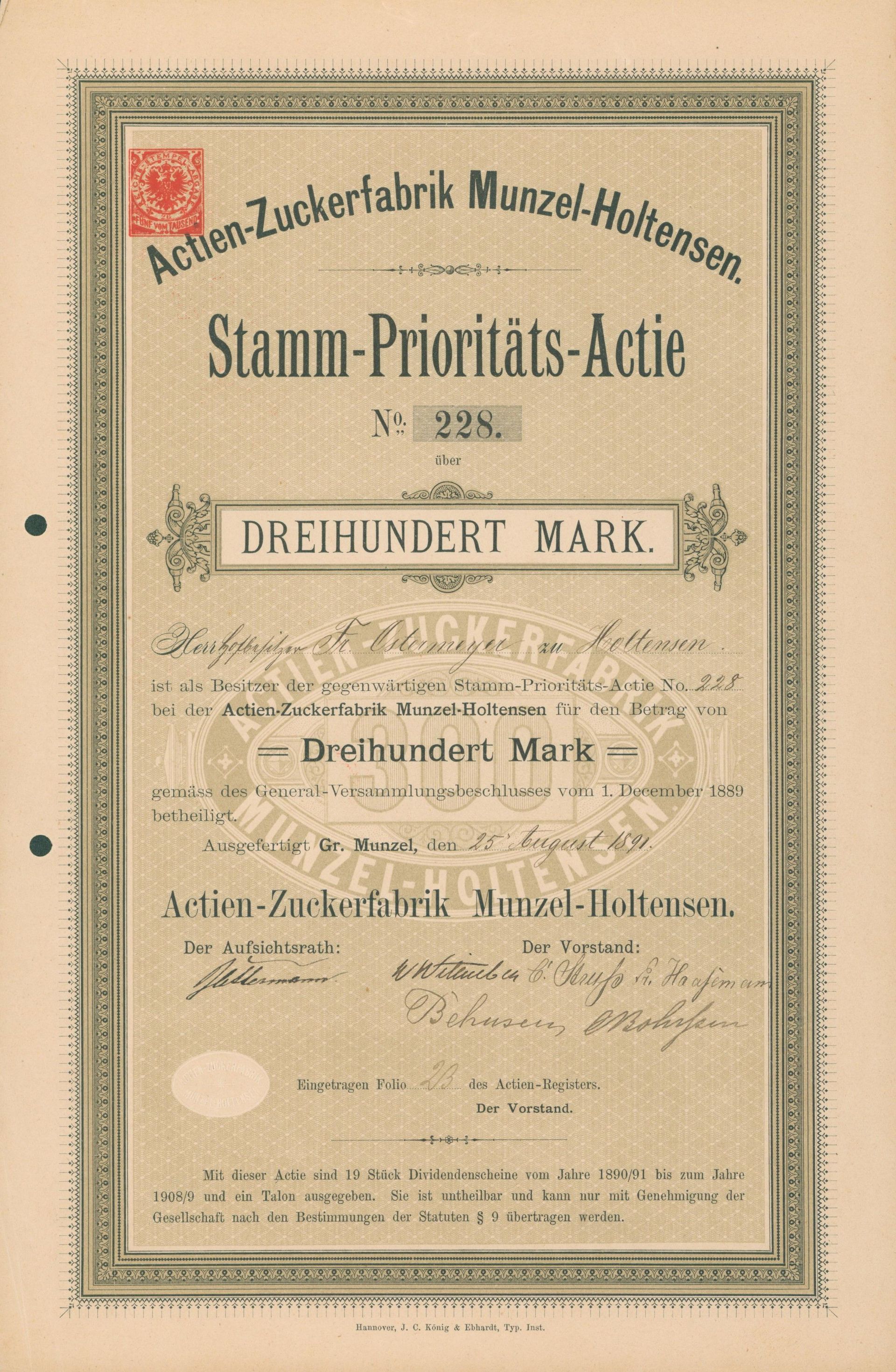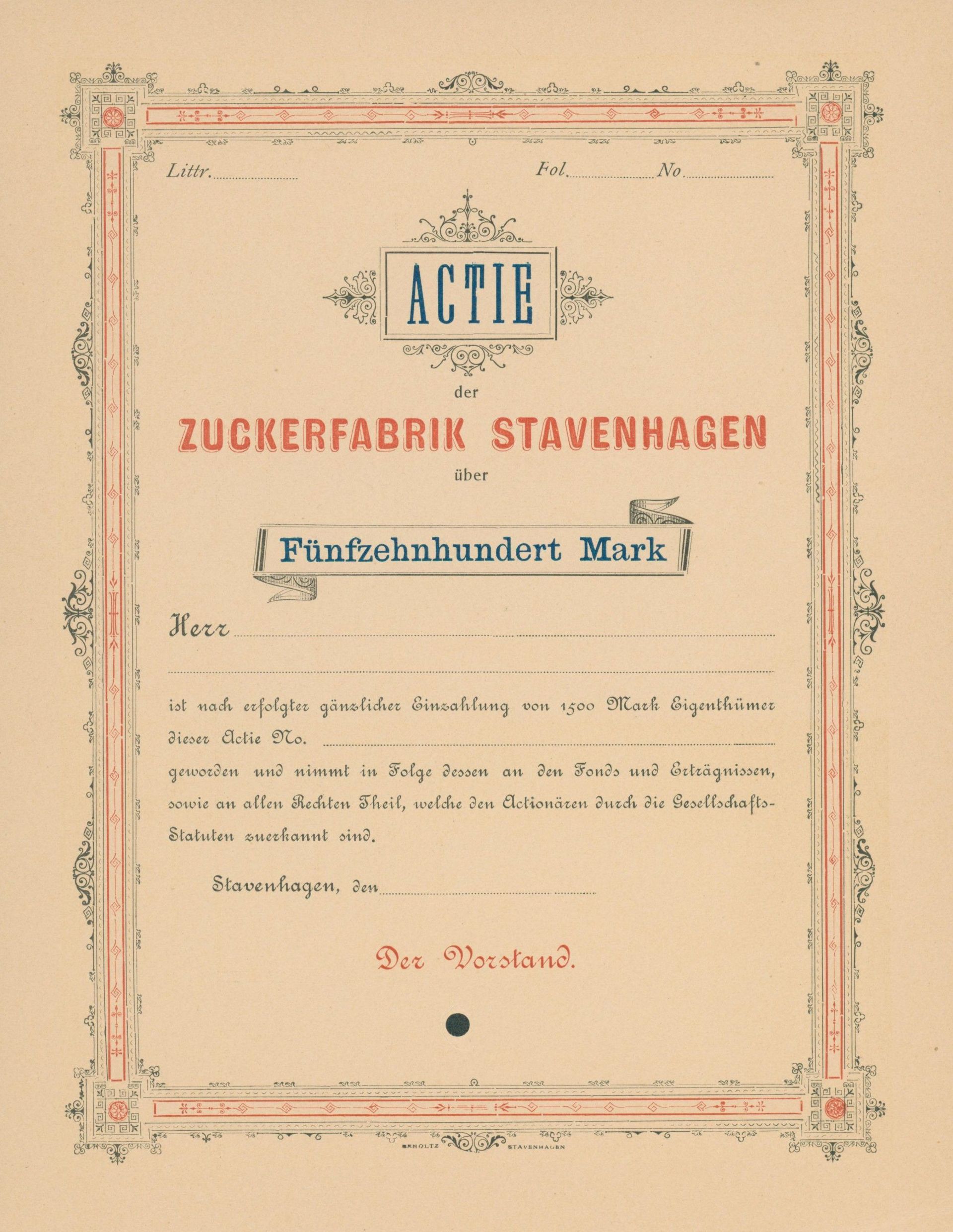 Die älteste bekannte deutsche Aktie aus der Zuckerindustrie - eine Raffinerie in Königsberg.