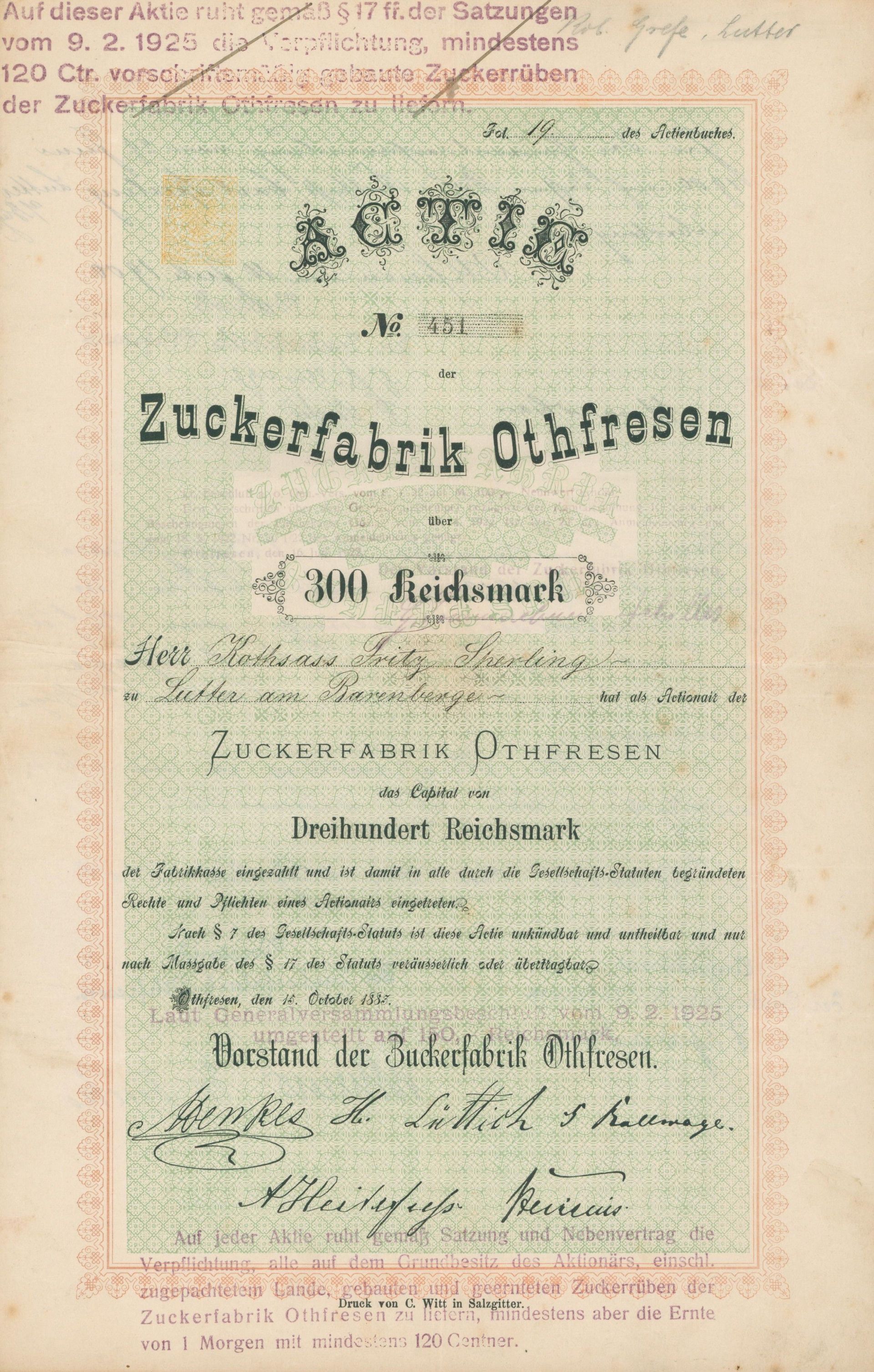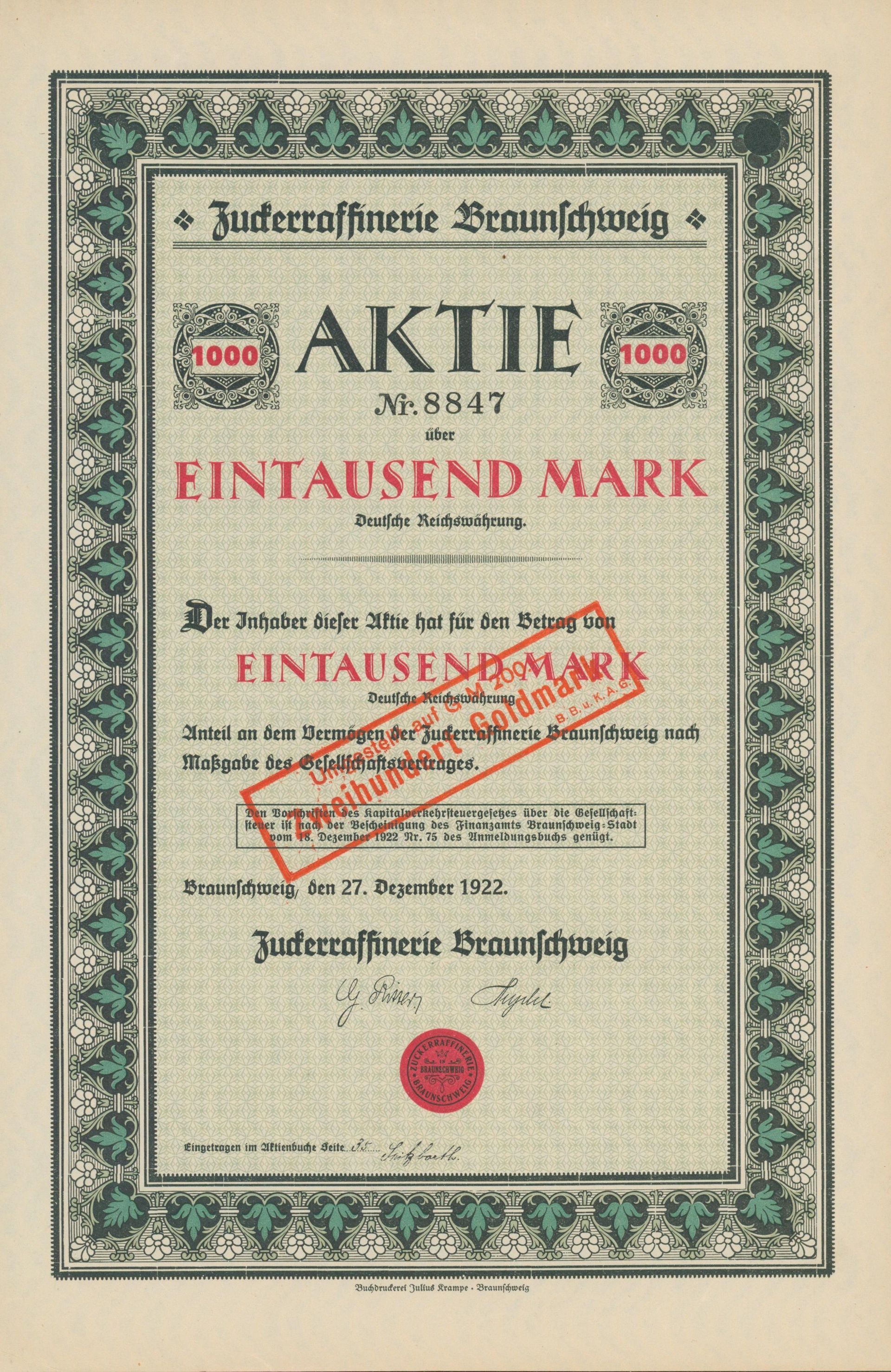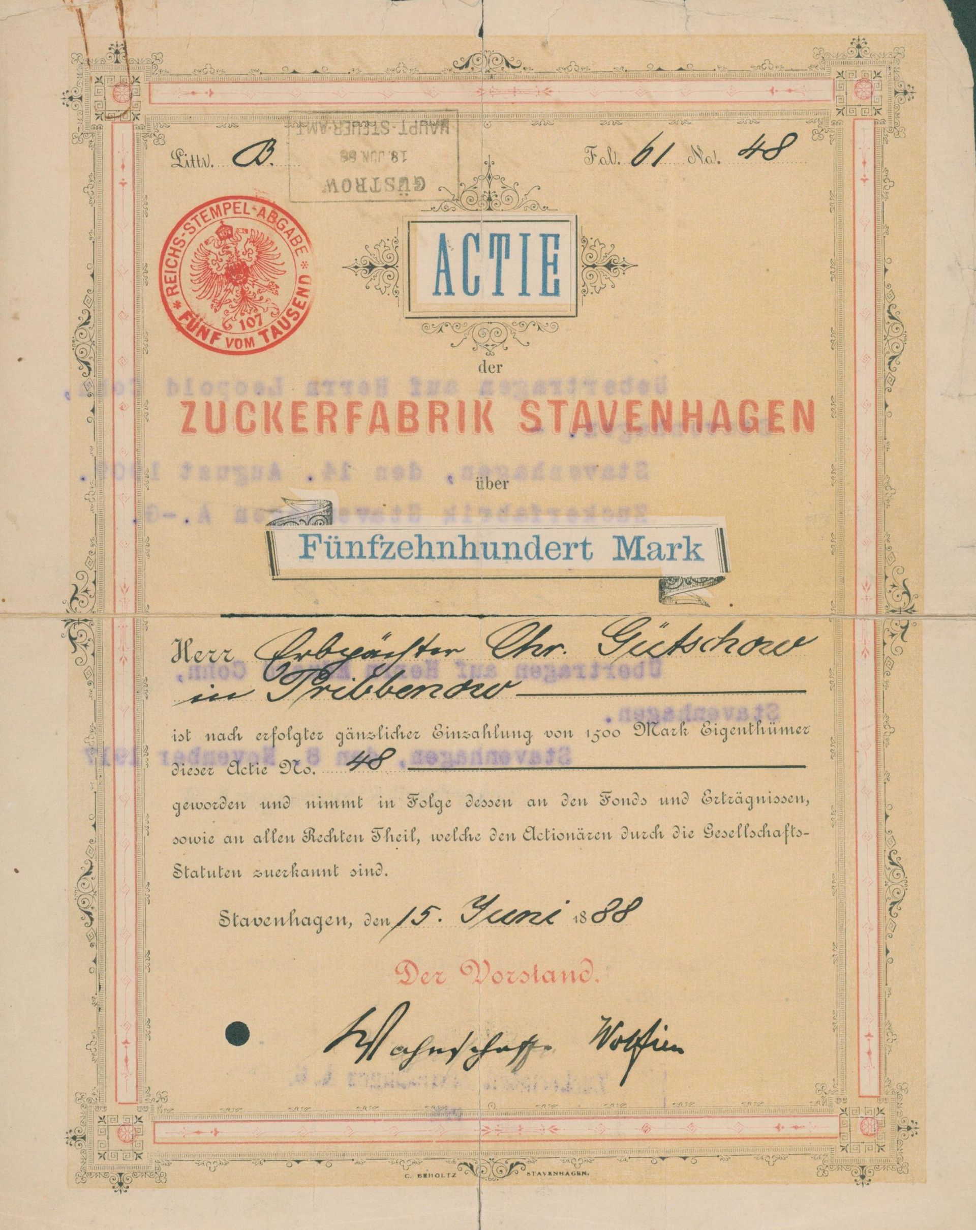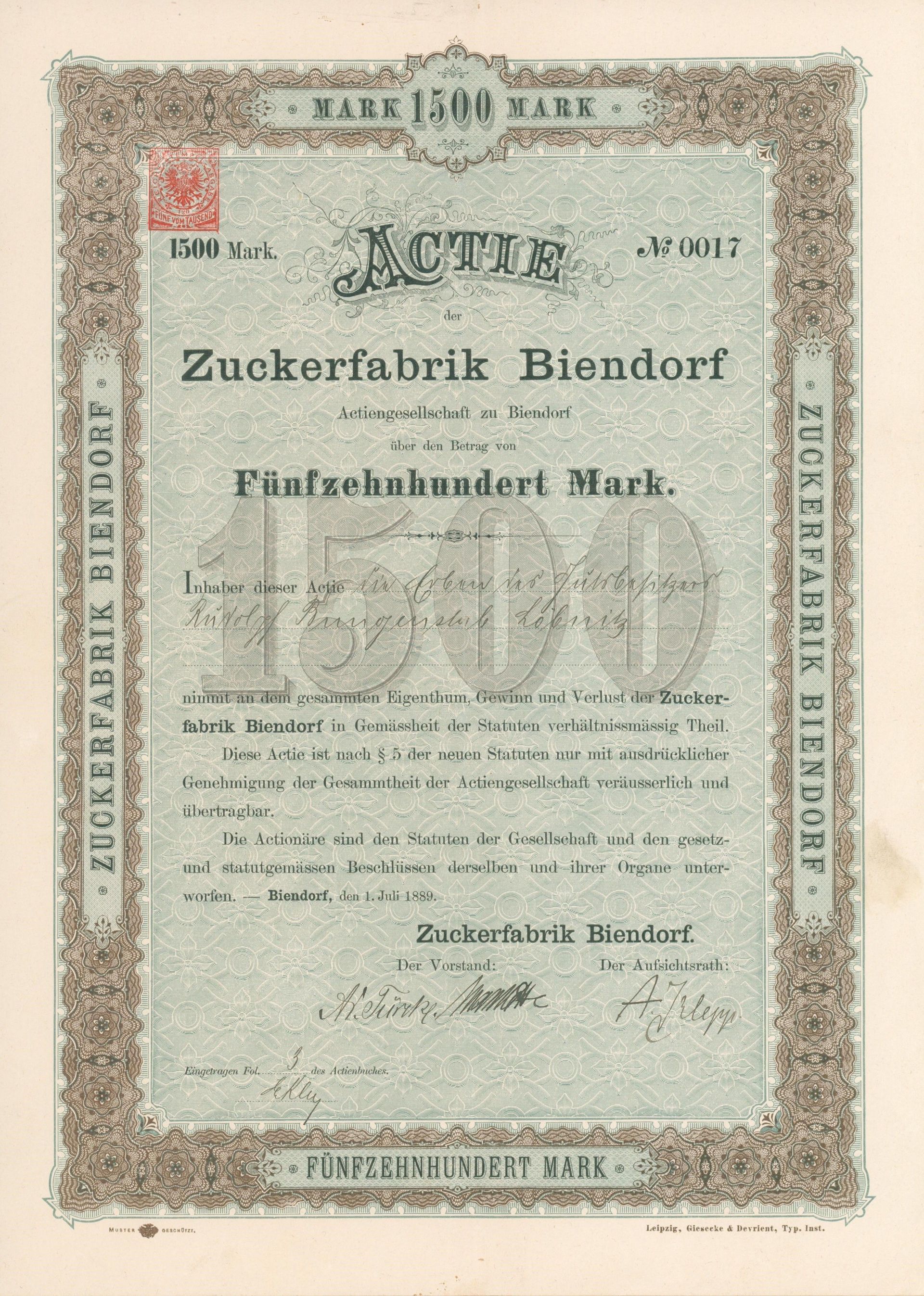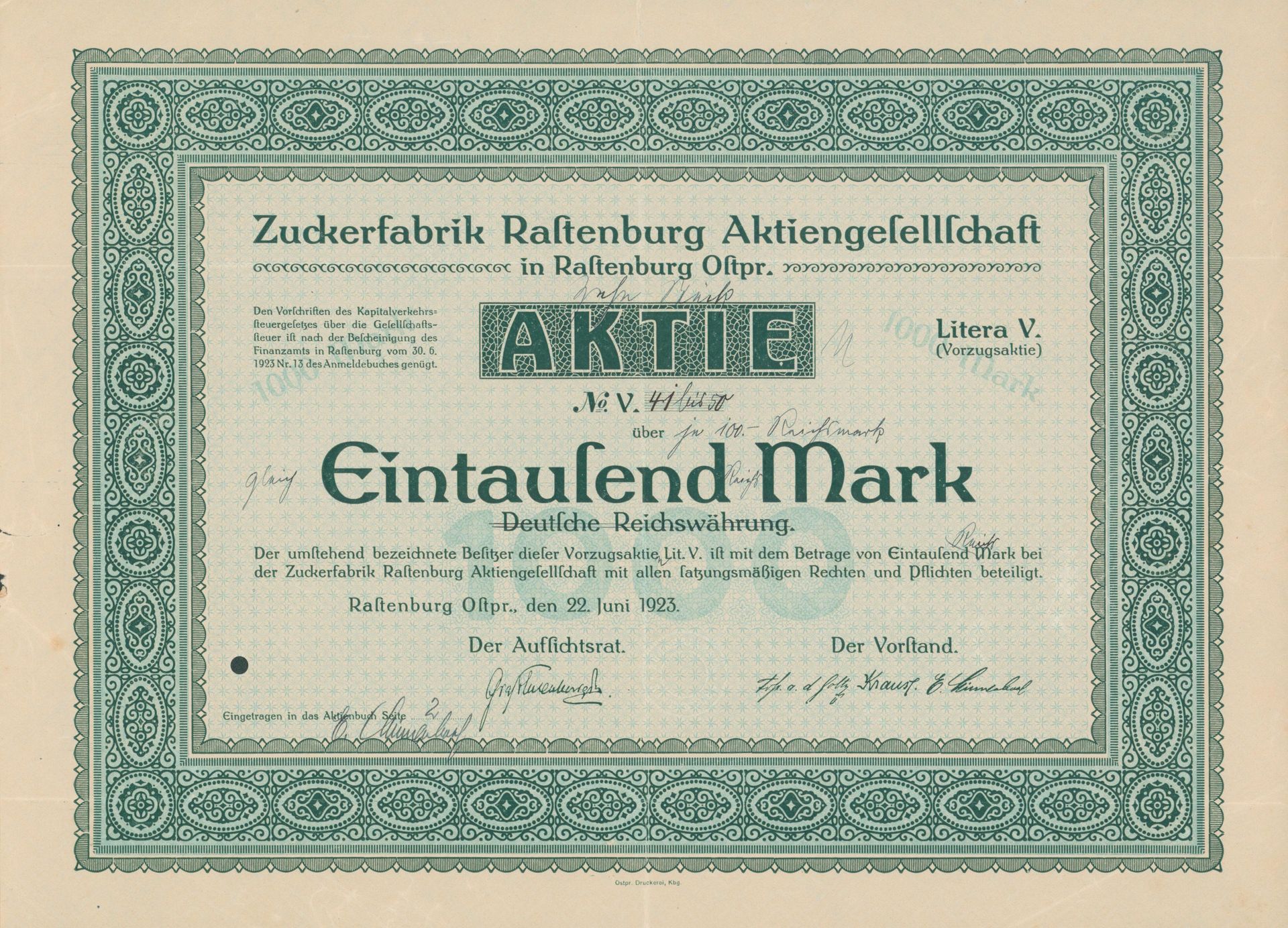 Die älteste bekannte deutsche Aktie aus der Zuckerindustrie - eine Raffinerie in Königsberg.