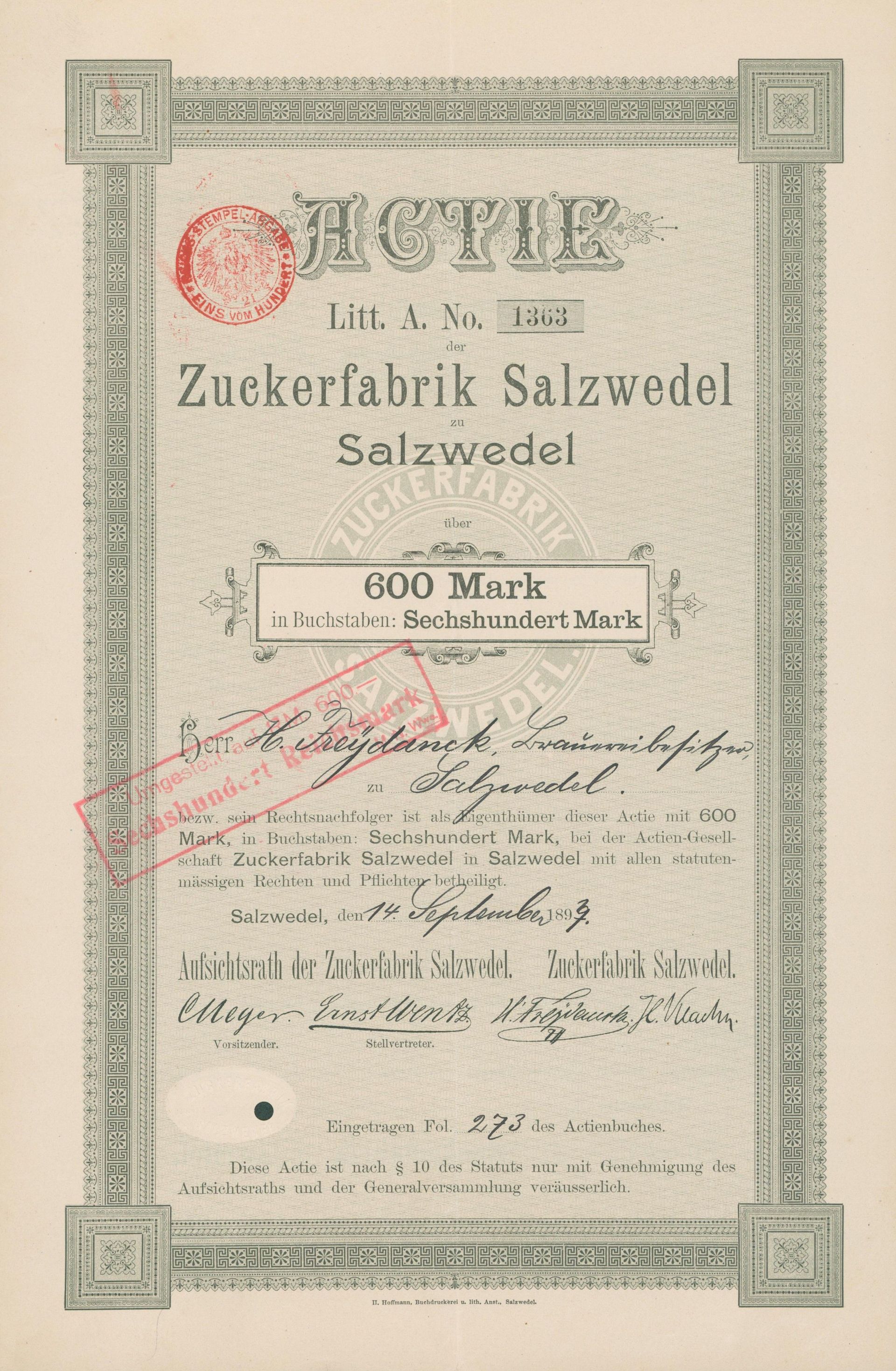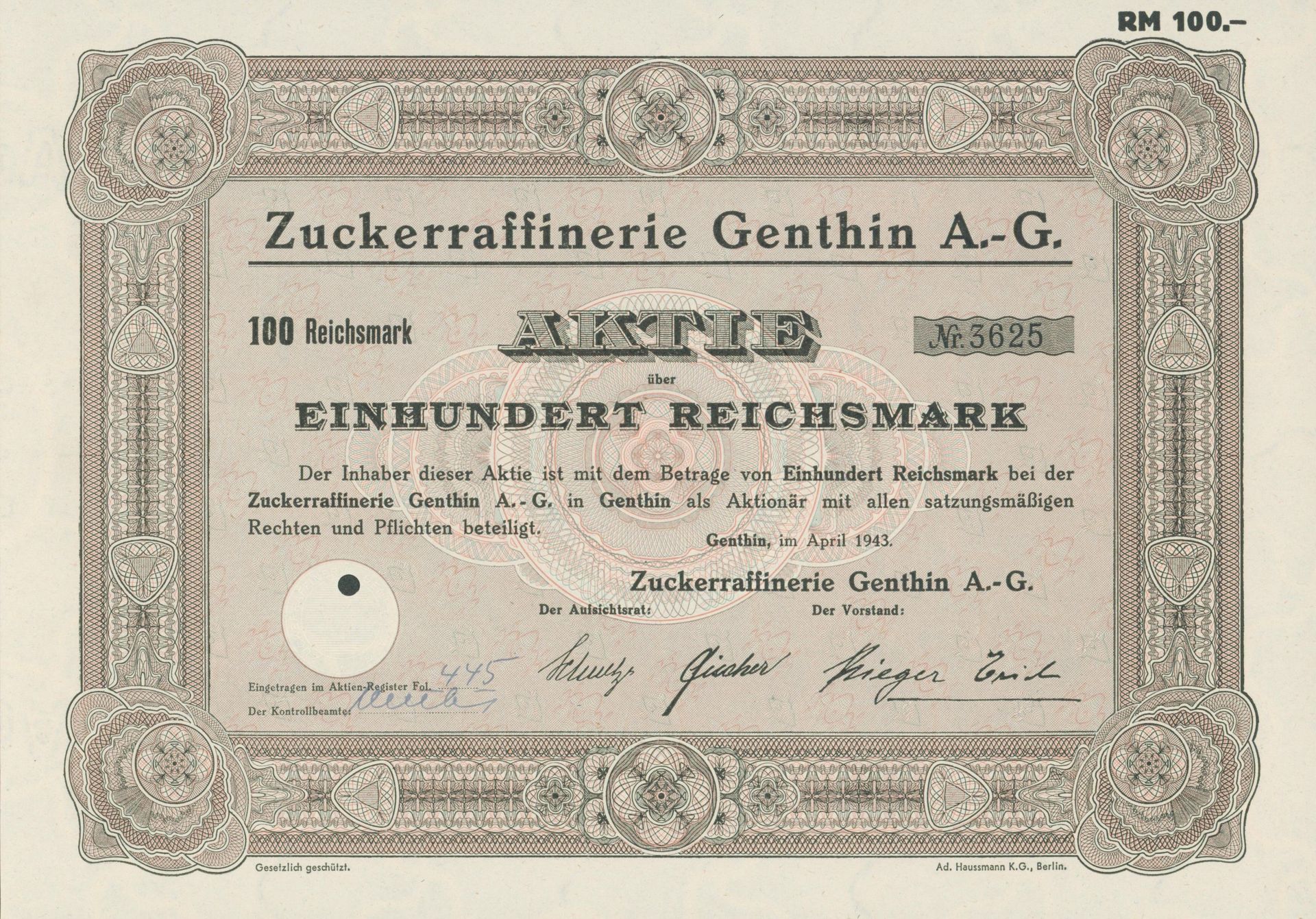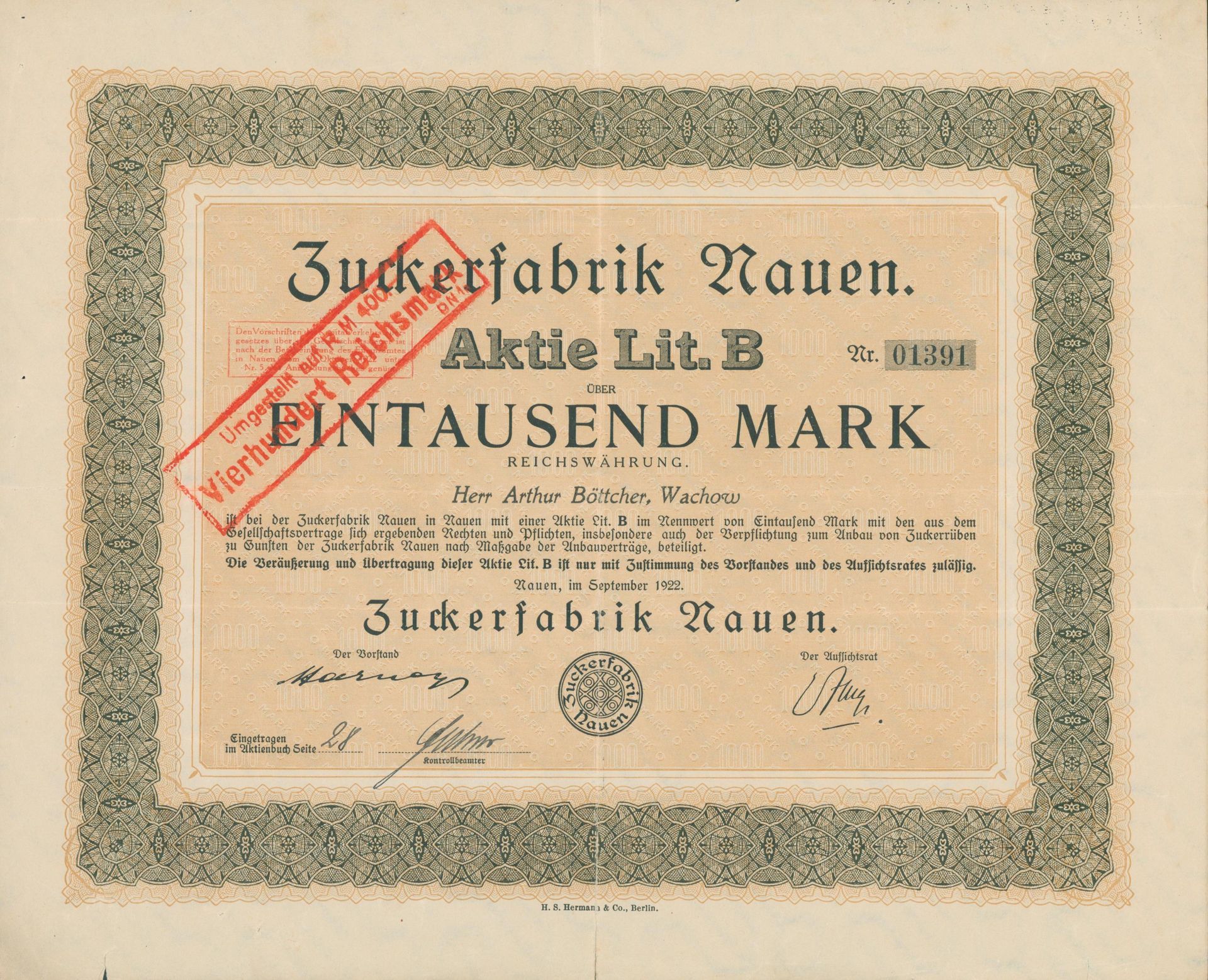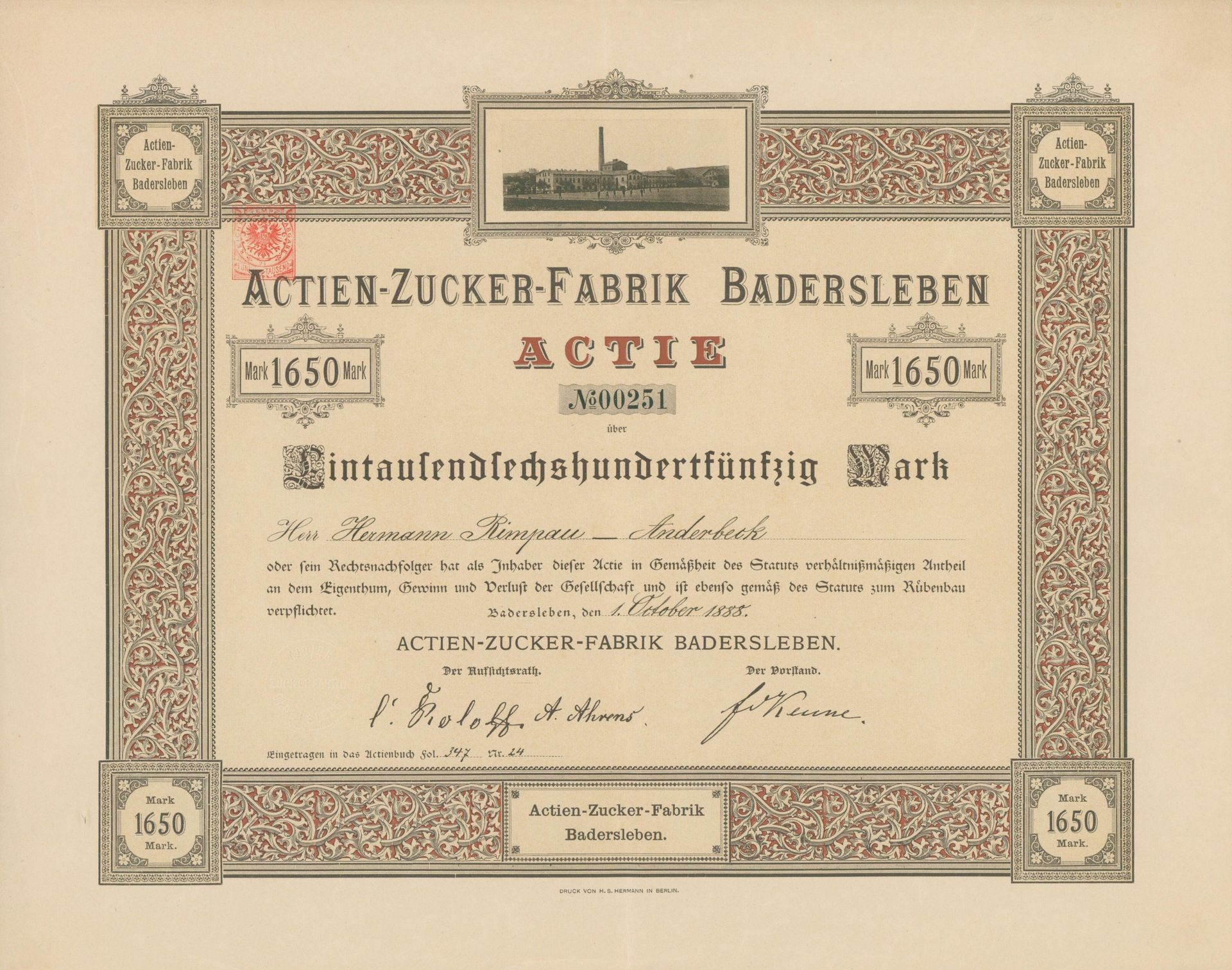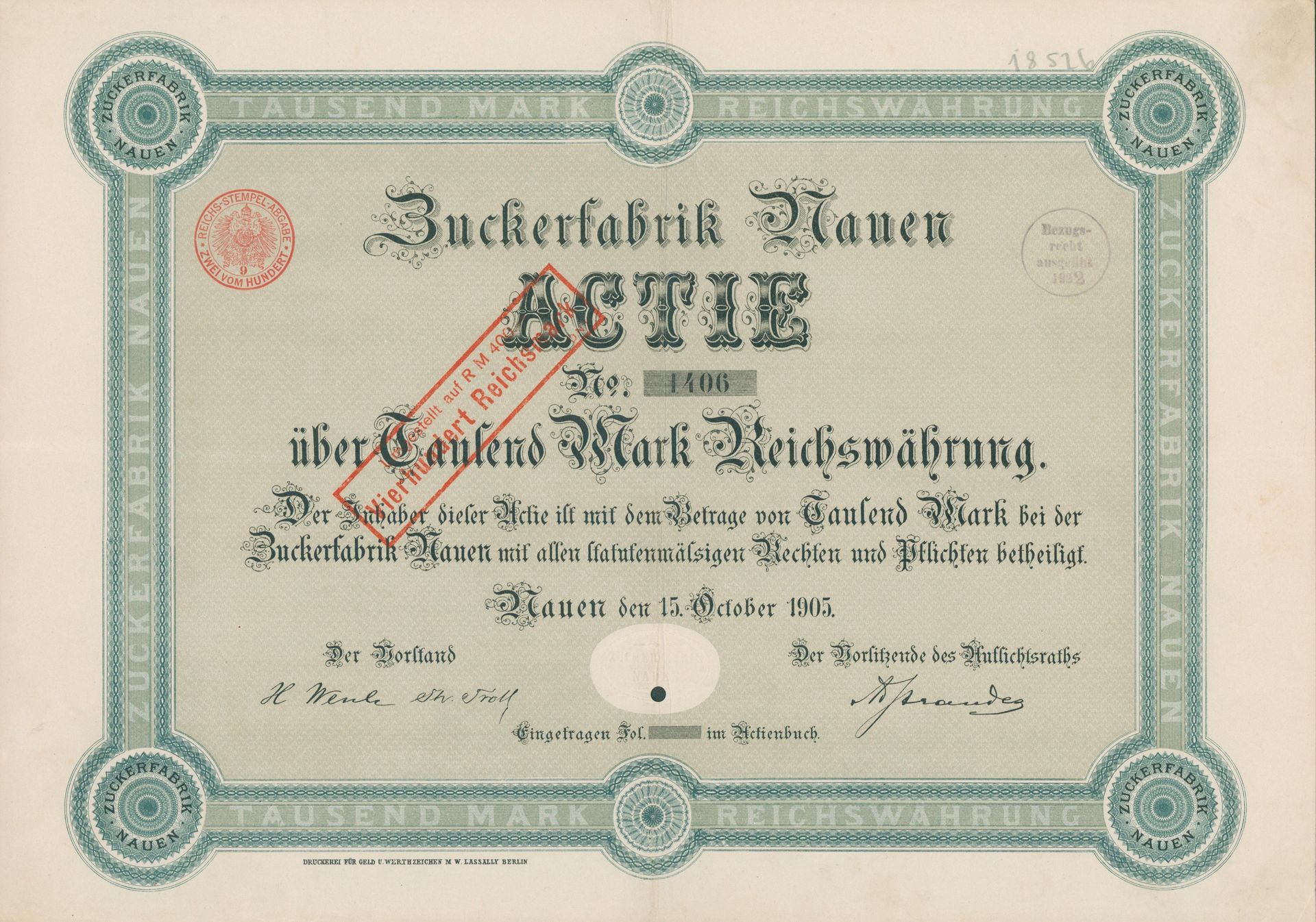 Die älteste bekannte deutsche Aktie aus der Zuckerindustrie - eine Raffinerie in Königsberg.