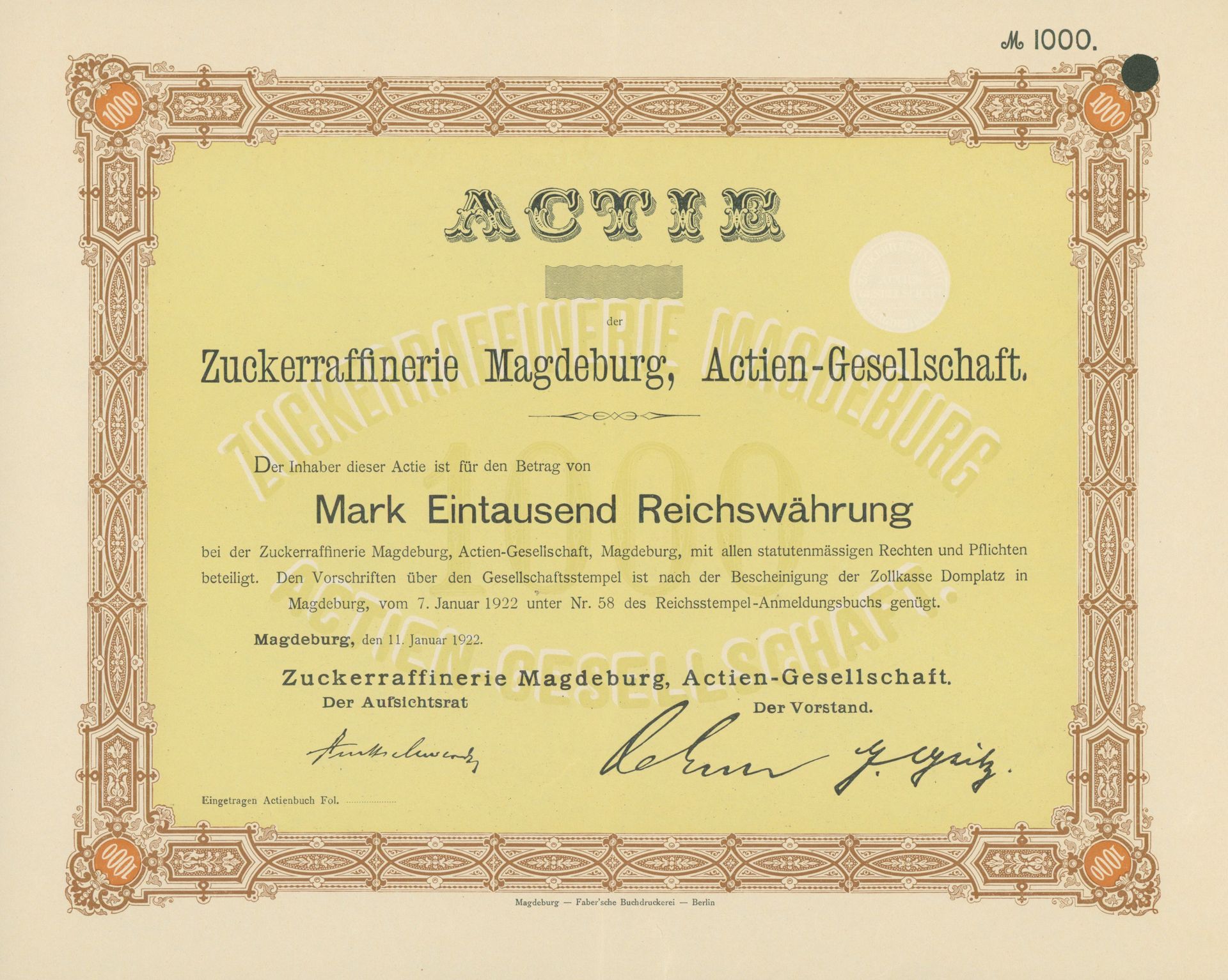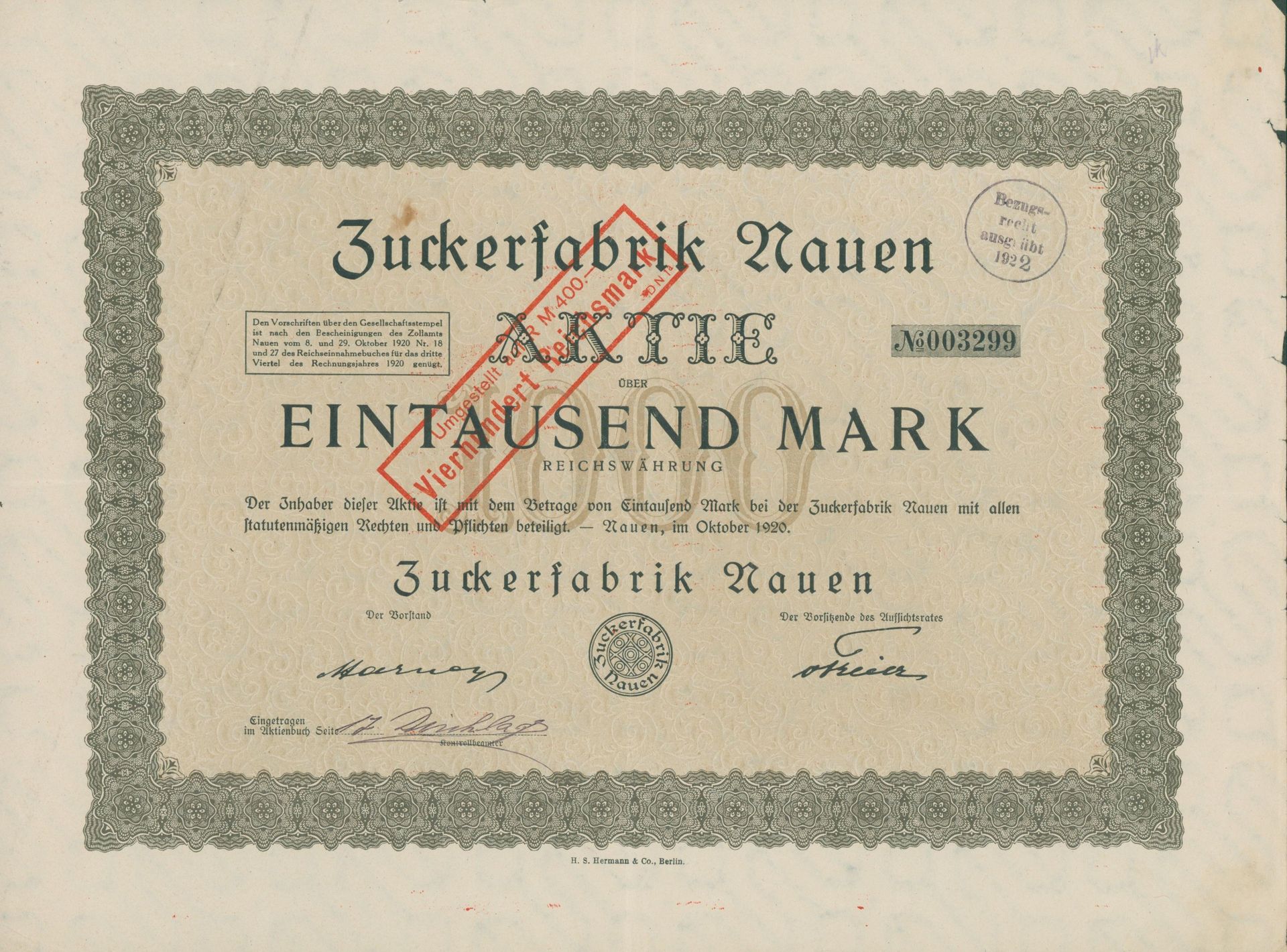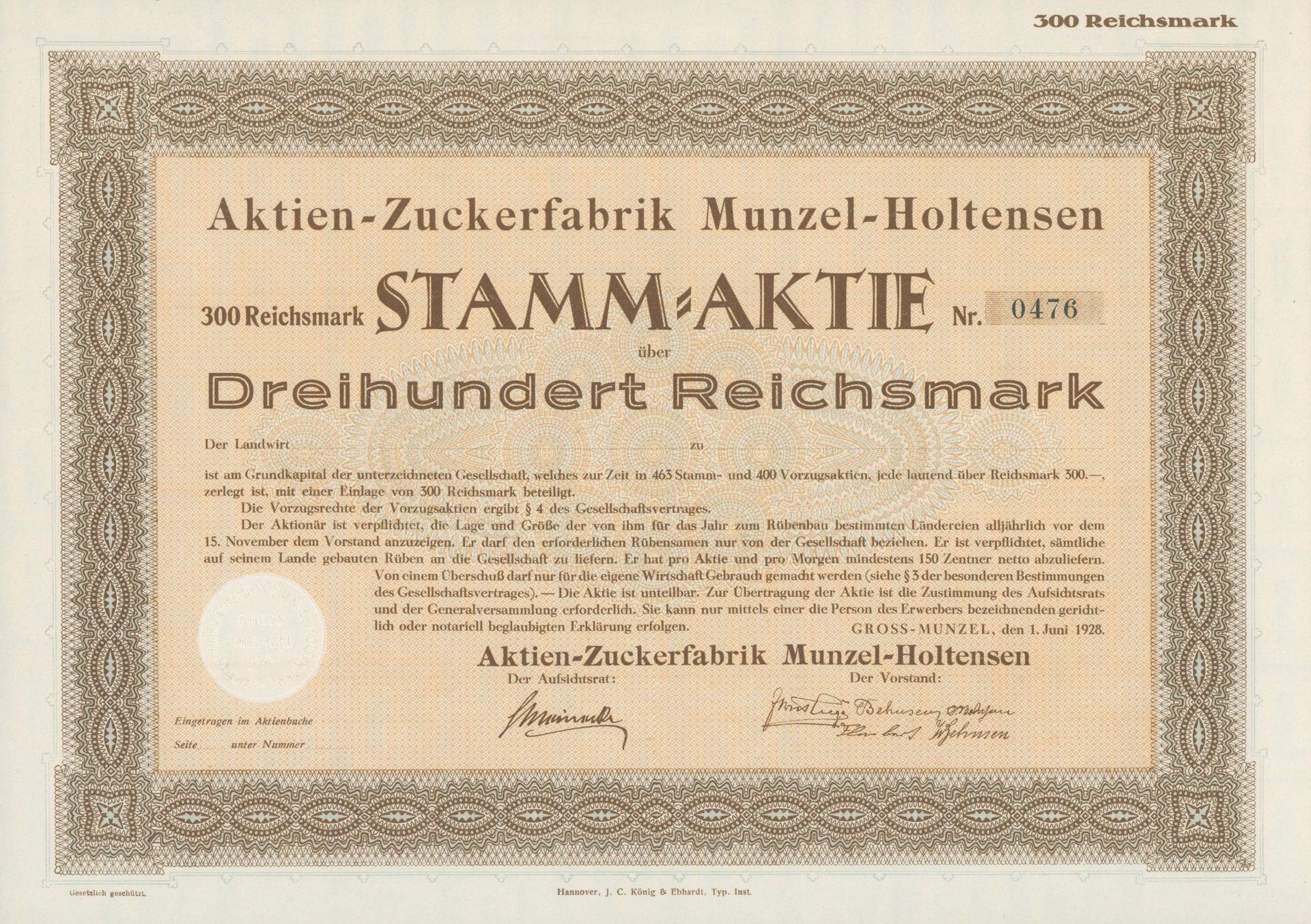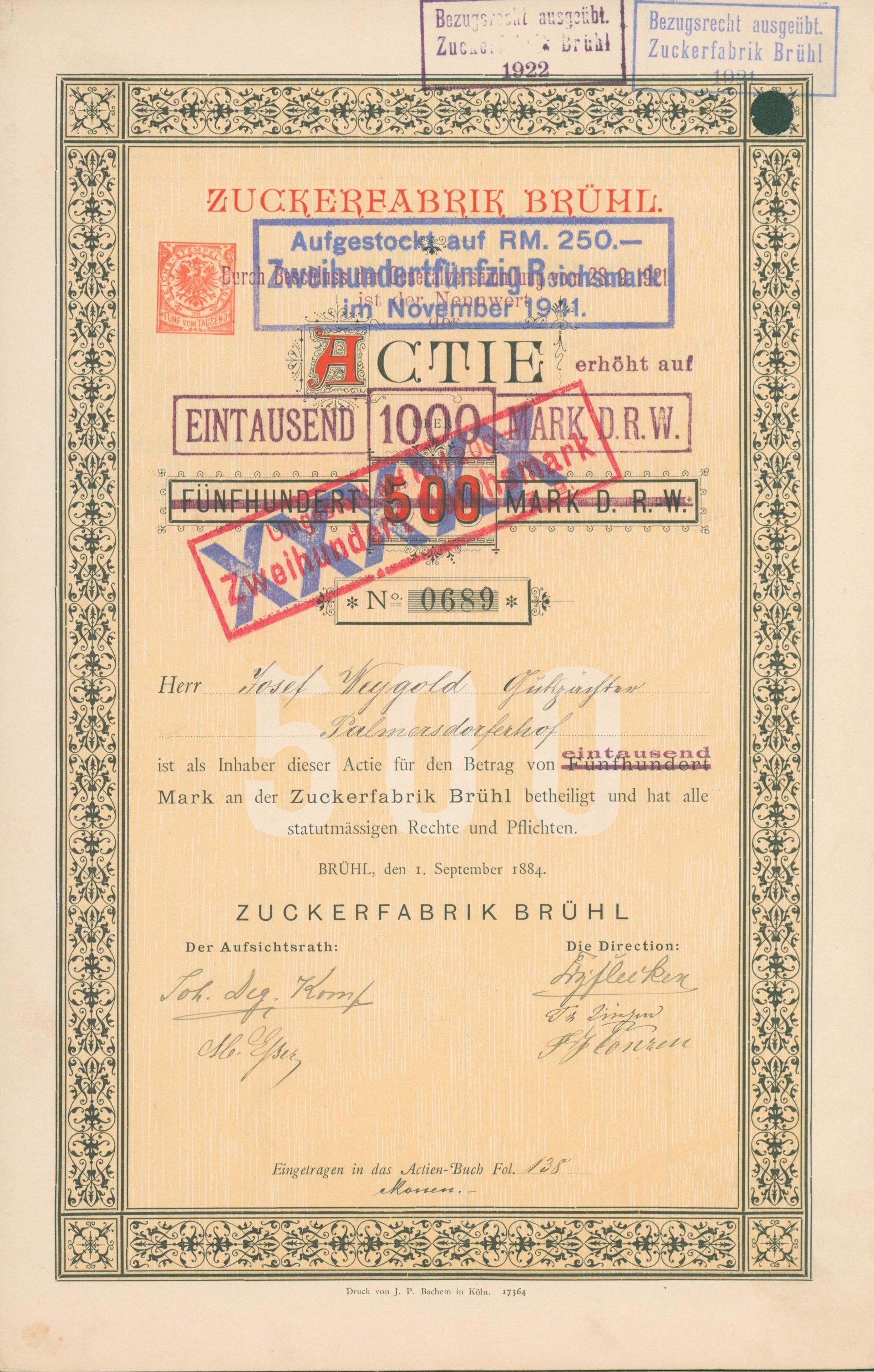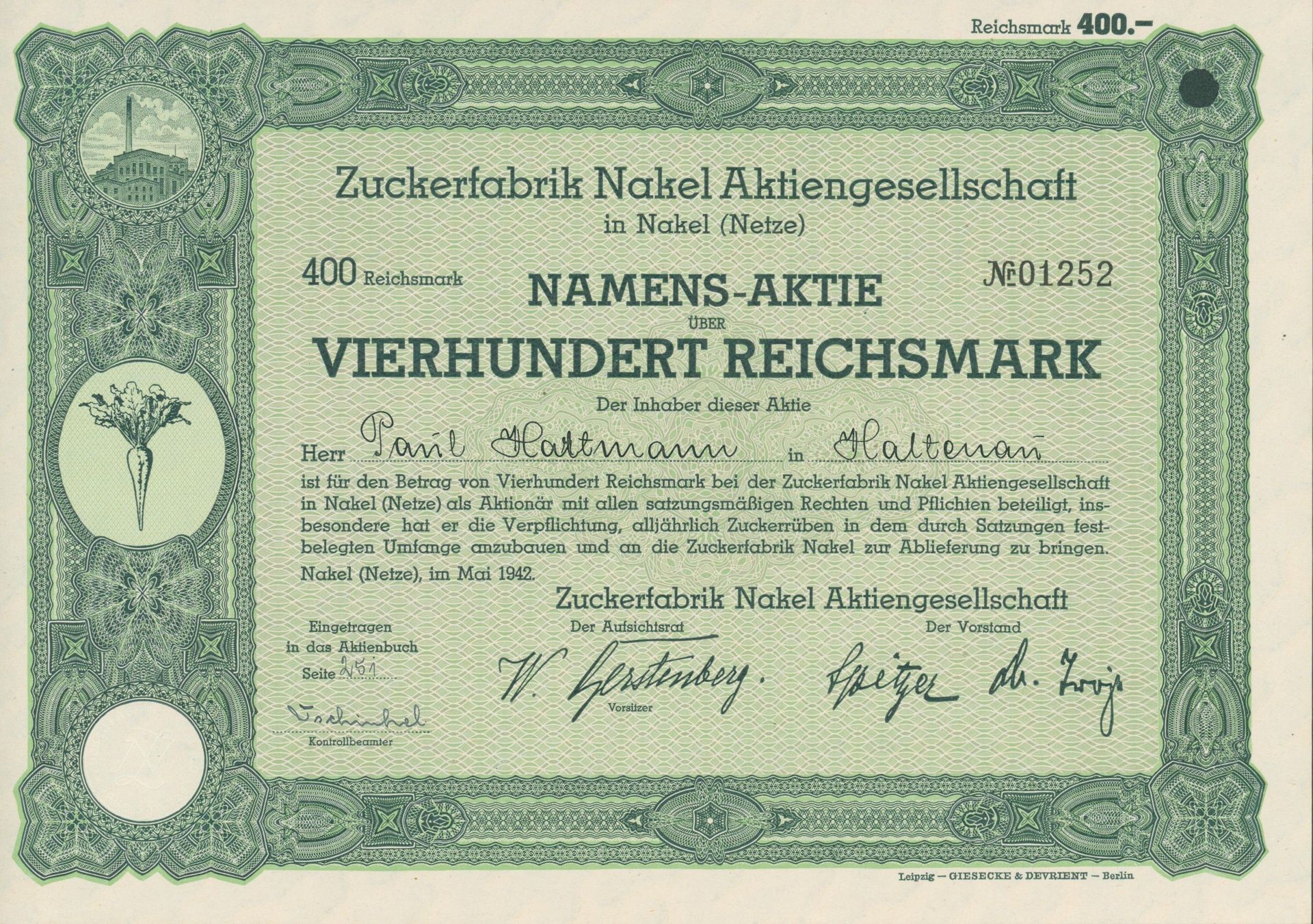 Die älteste bekannte deutsche Aktie aus der Zuckerindustrie - eine Raffinerie in Königsberg.