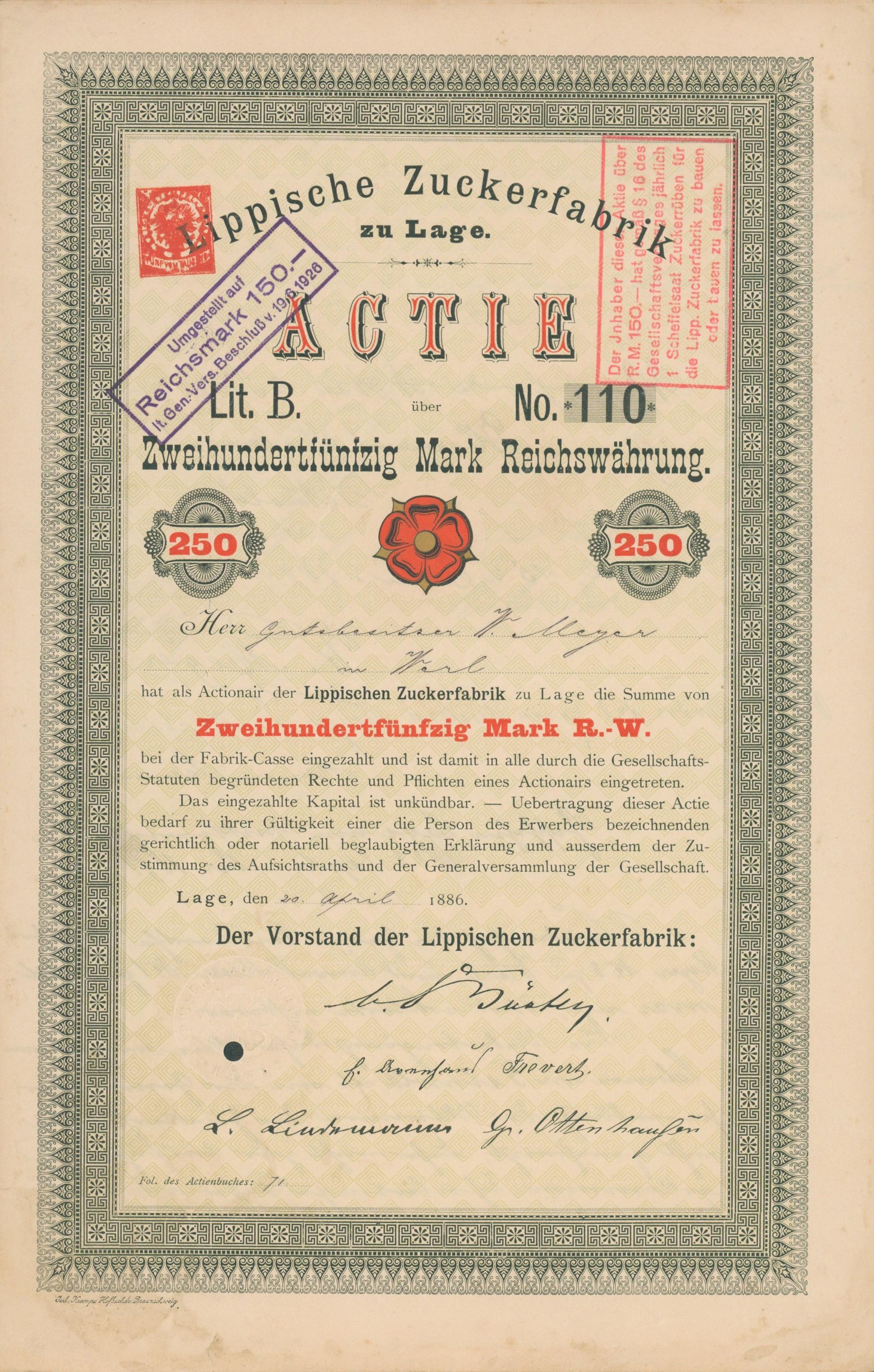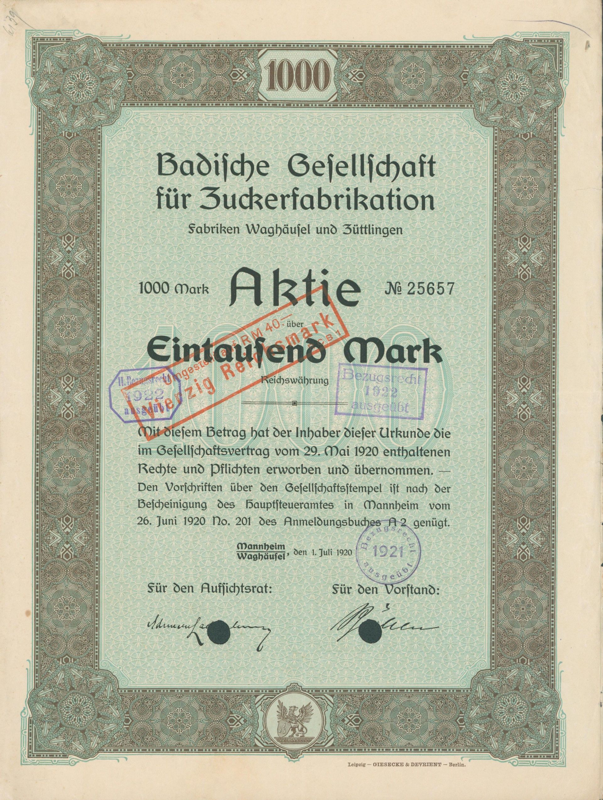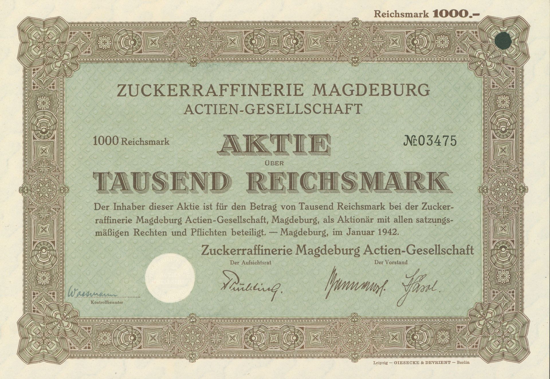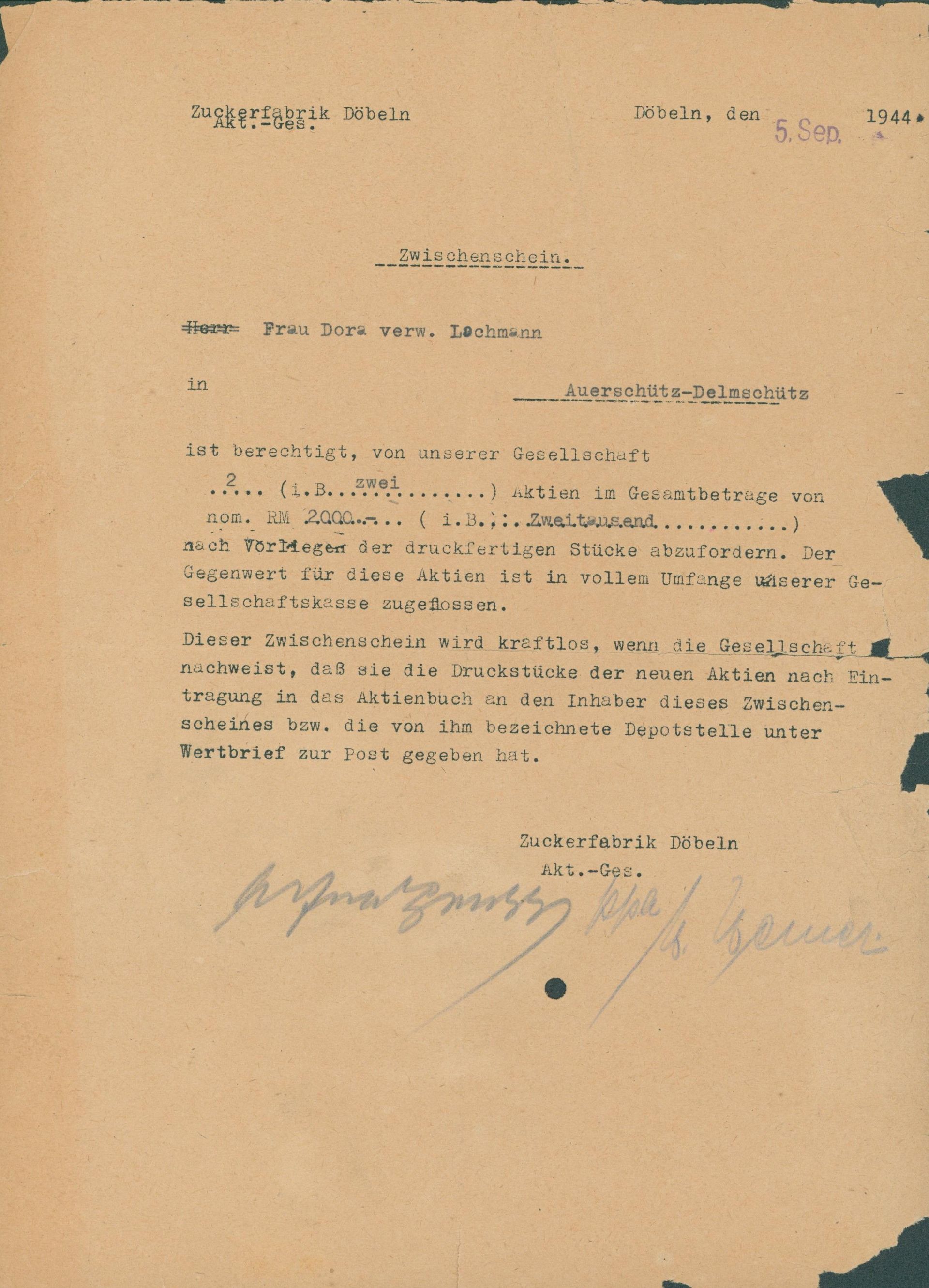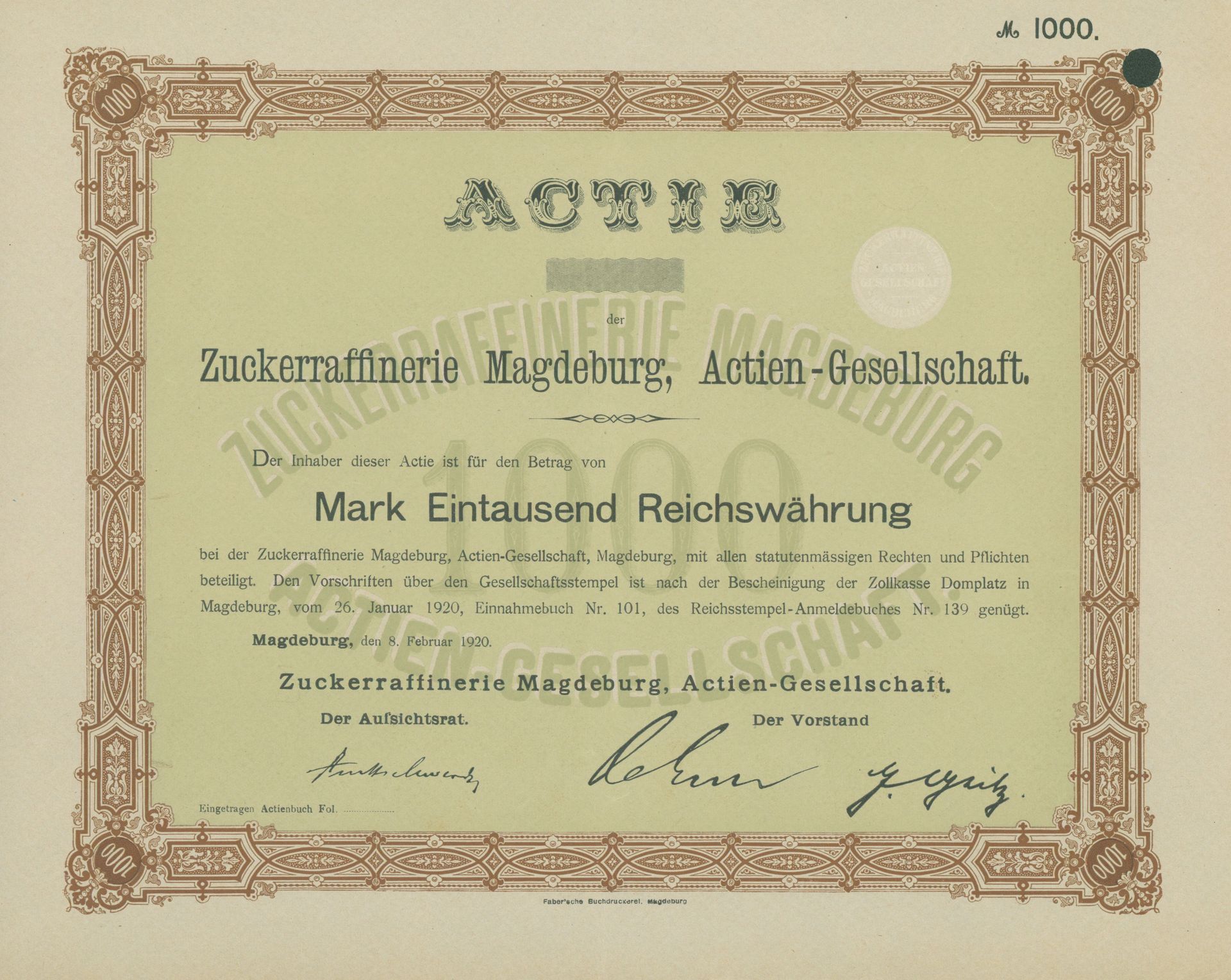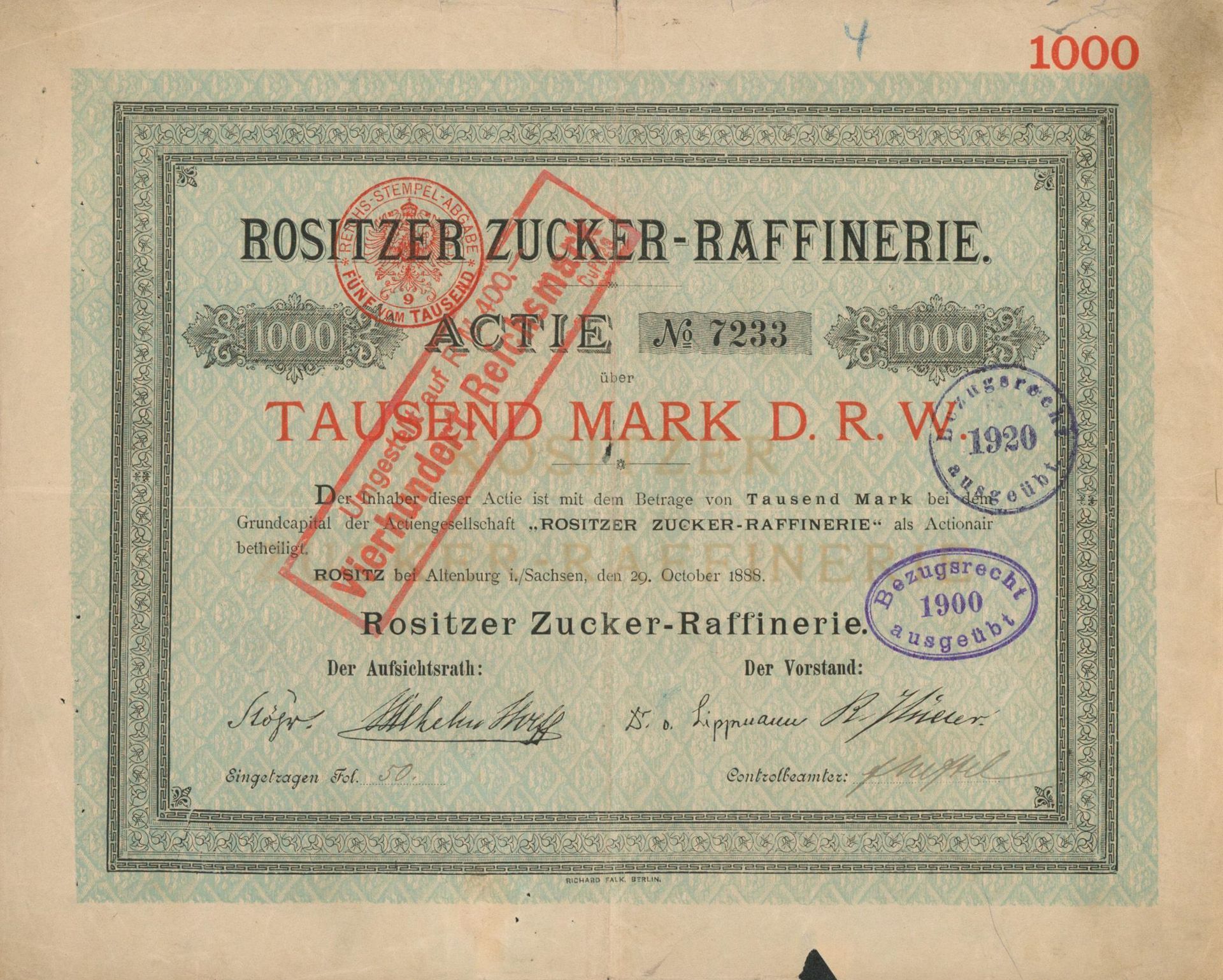 Die älteste bekannte deutsche Aktie aus der Zuckerindustrie - eine Raffinerie in Königsberg.
