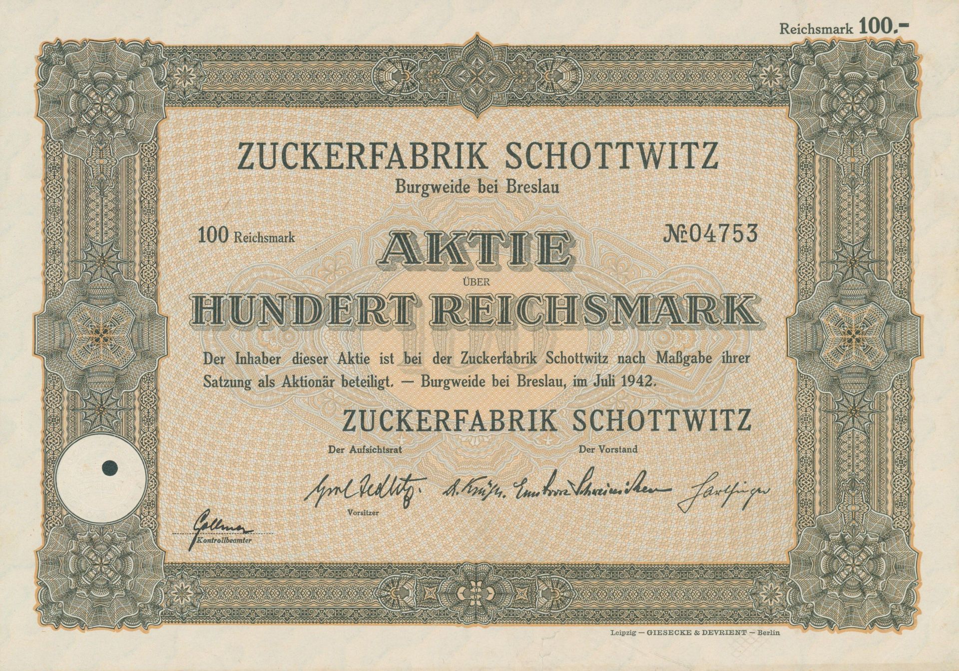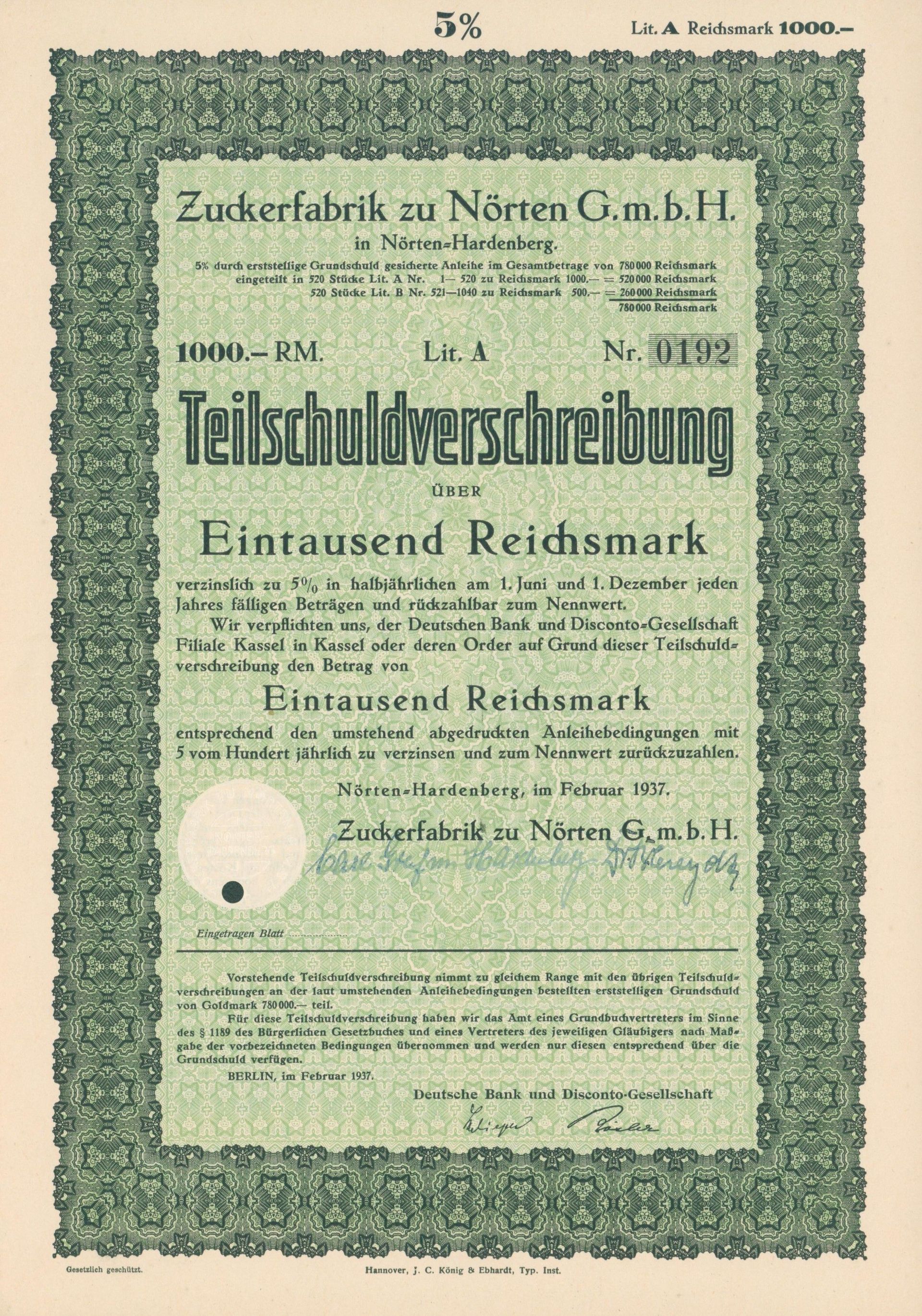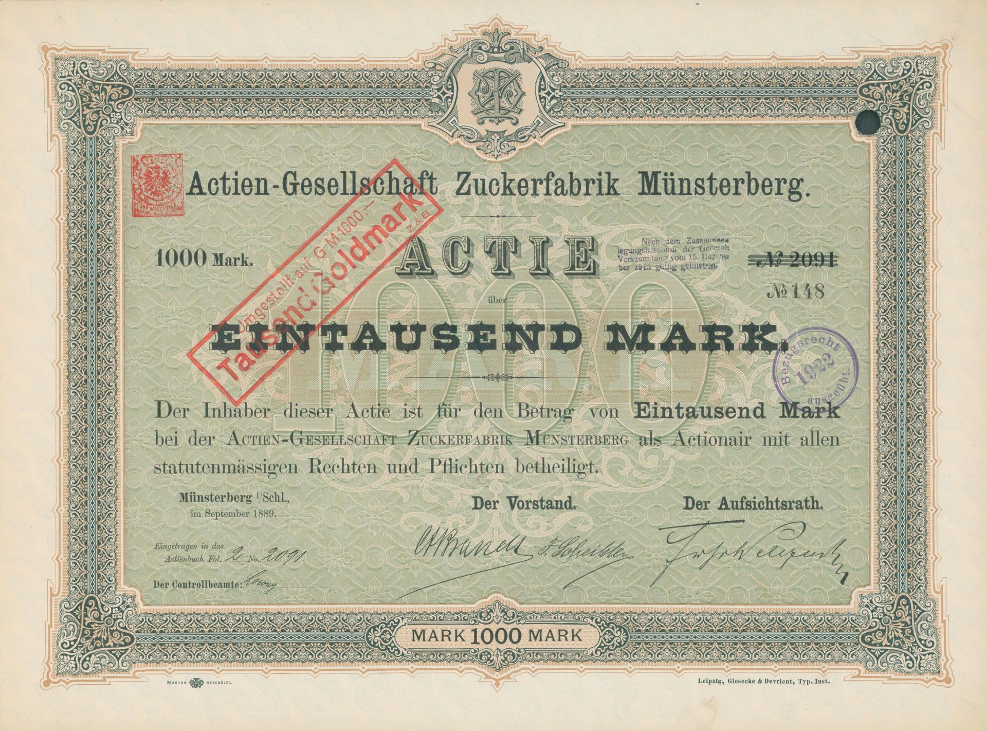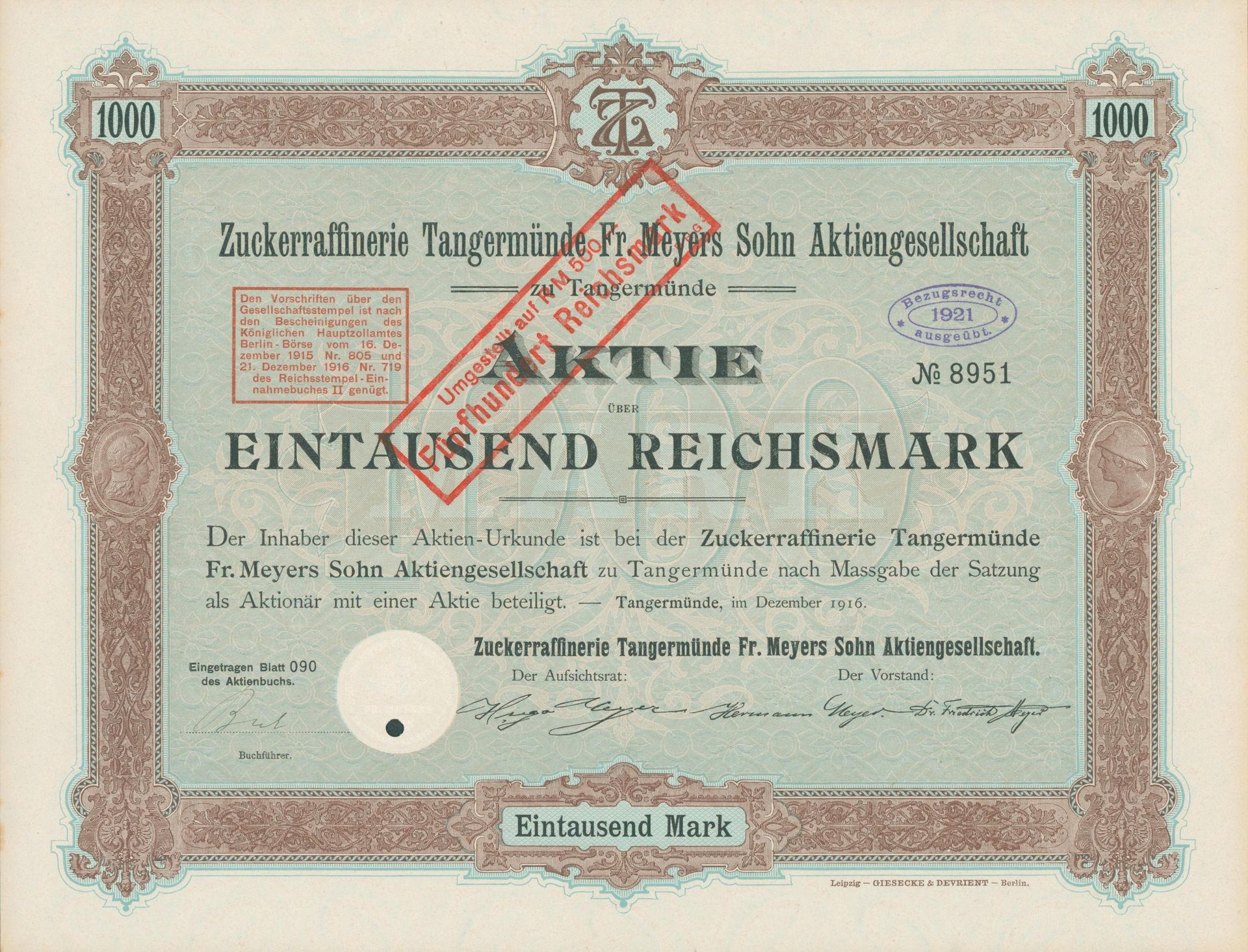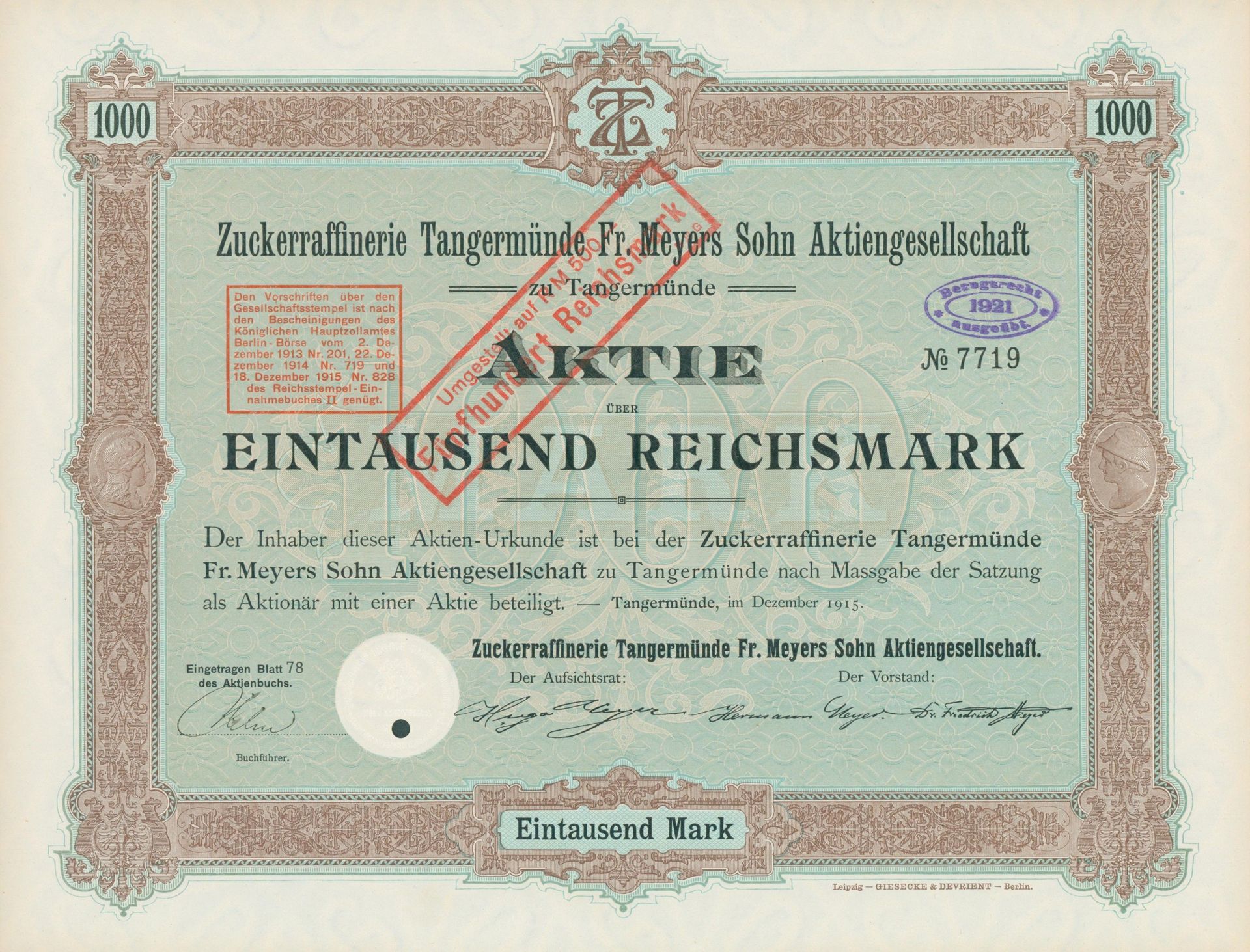Die älteste bekannte deutsche Aktie aus der Zuckerindustrie - eine Raffinerie in Königsberg.