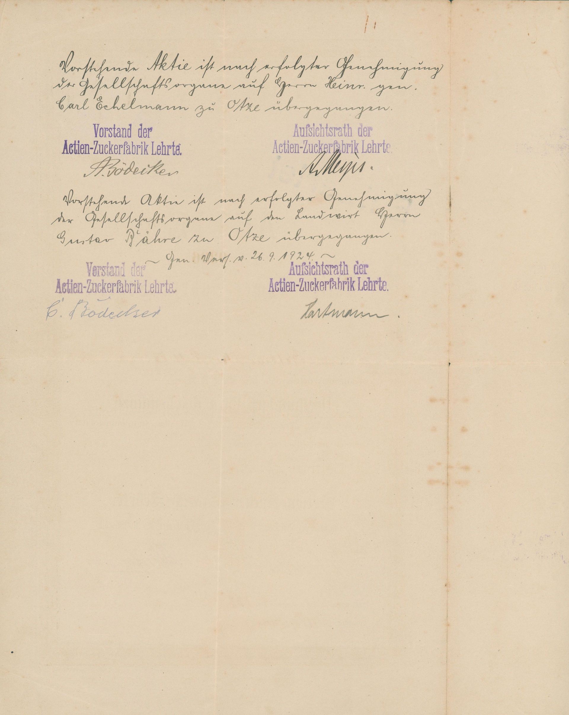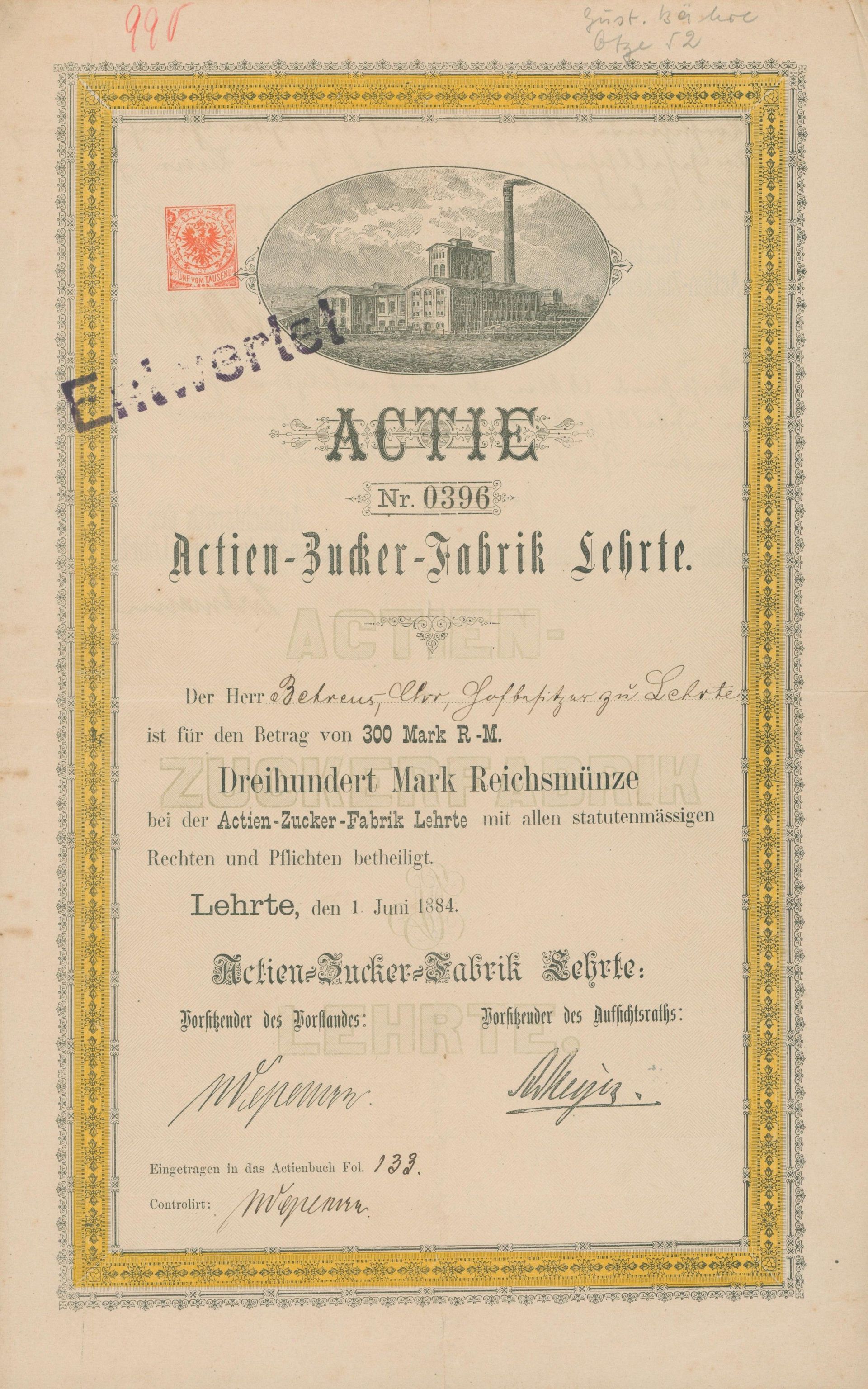 Ausgestellt auf den Gutsbesitzer Behrens zu Lehrte. Per Stempel entwertet. Inseitig Übertragungsvermerke bis 1924.