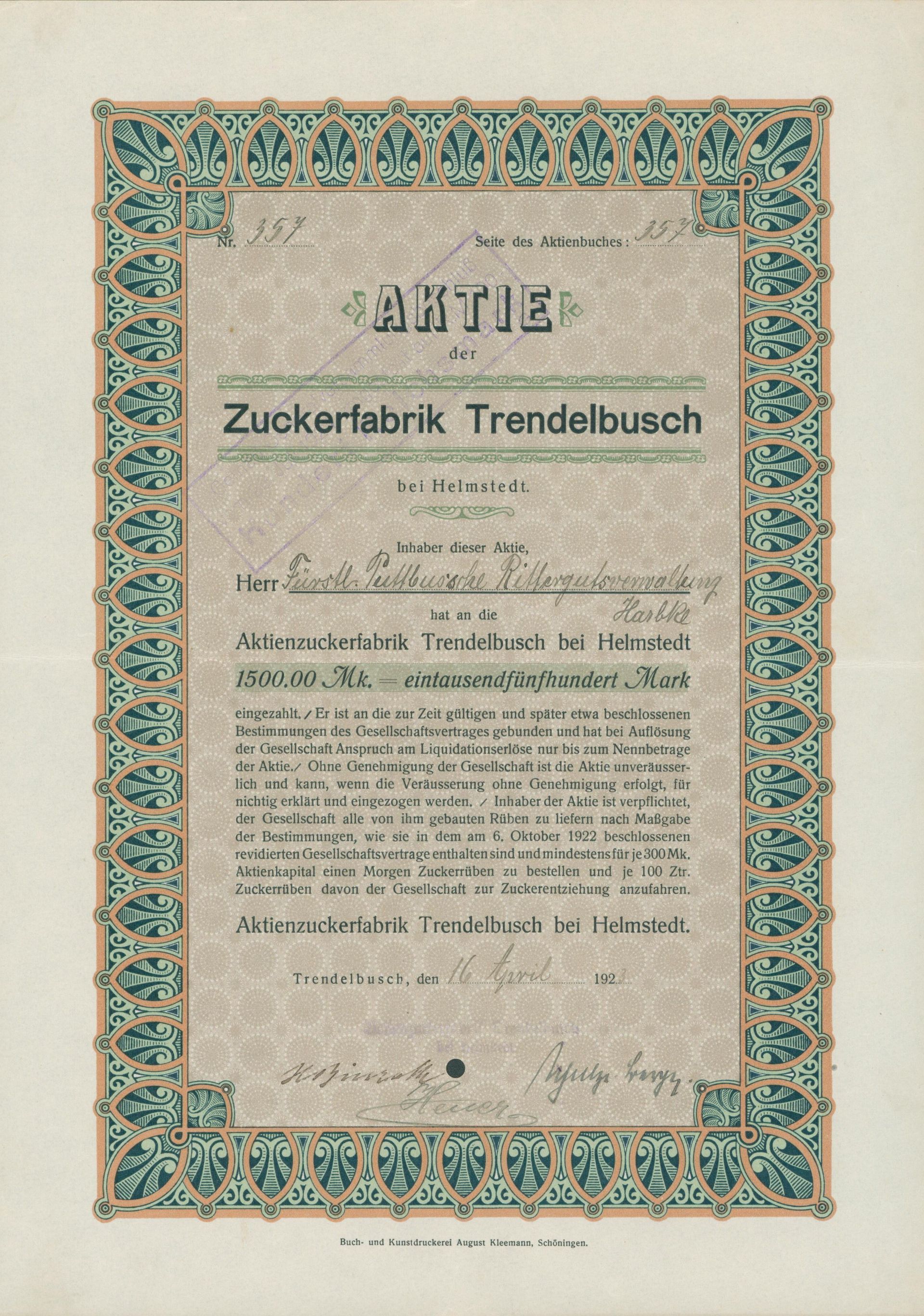 Aktie | April 16, 1923 | One piece at 1500 Mark| Type | Aktie |