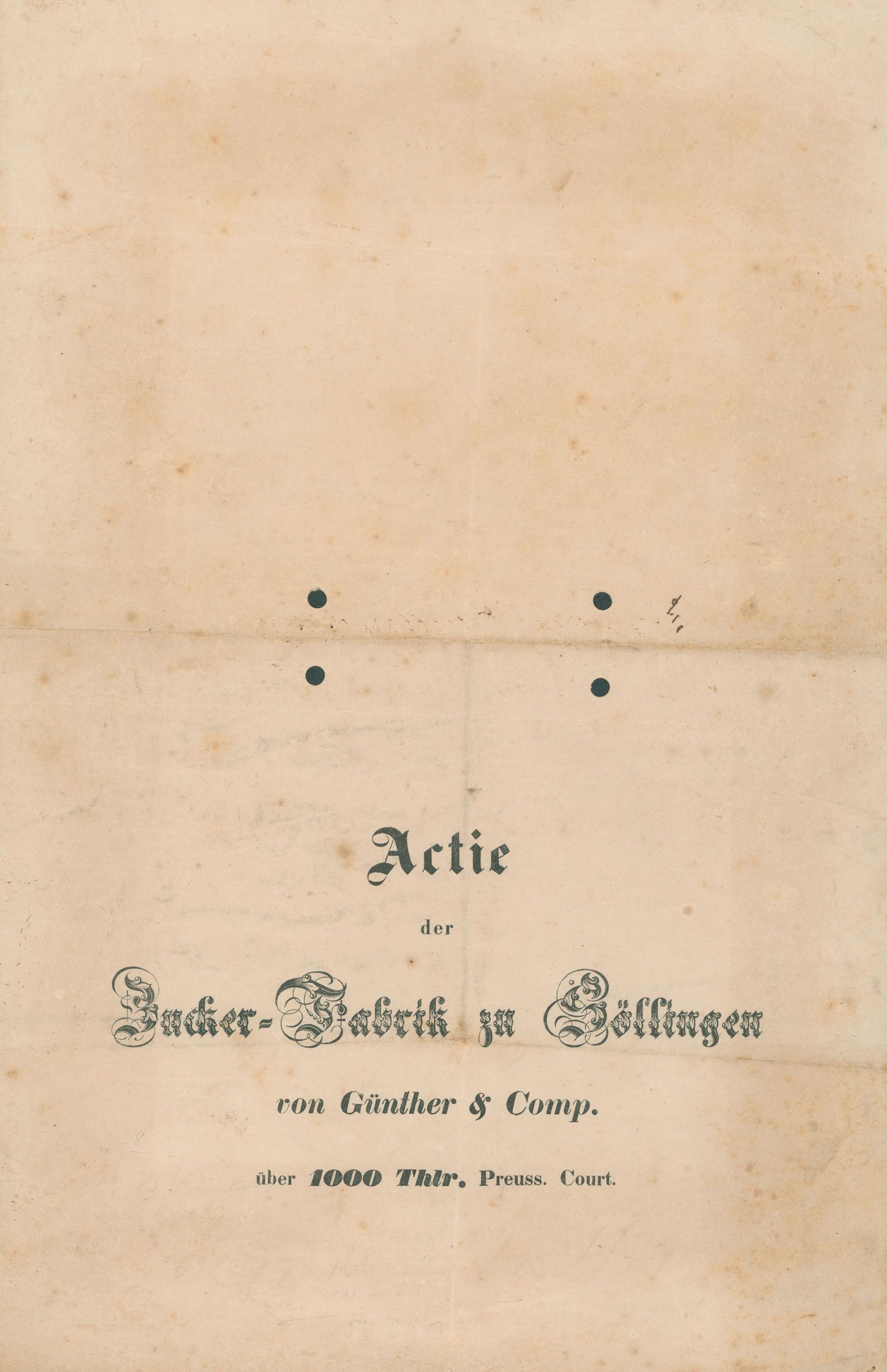 Prachtvolle, ungewöhnliche Gestaltung mit einer großen Bordüre inklusive Abbildungen aus der Zuckerindustrie und einer großen Vignette der altertümlichen Fabrik. Unterschrift des namensgebenden "Vorstehers", Johann Andreas Günther. Ausgestellt auf Andreas Siemann III, Ingeleben. Inseitig Übertragungsvermerk aus dem Jahr 1872 als die Gesellschaft als Actien-Zucker-Fabrik Söllingen firmierte. Abheftlochung. Sehr seltenes Wertpapier und unter den ältesten Wertpapieren aus der deutschen Zuckerindustrie.