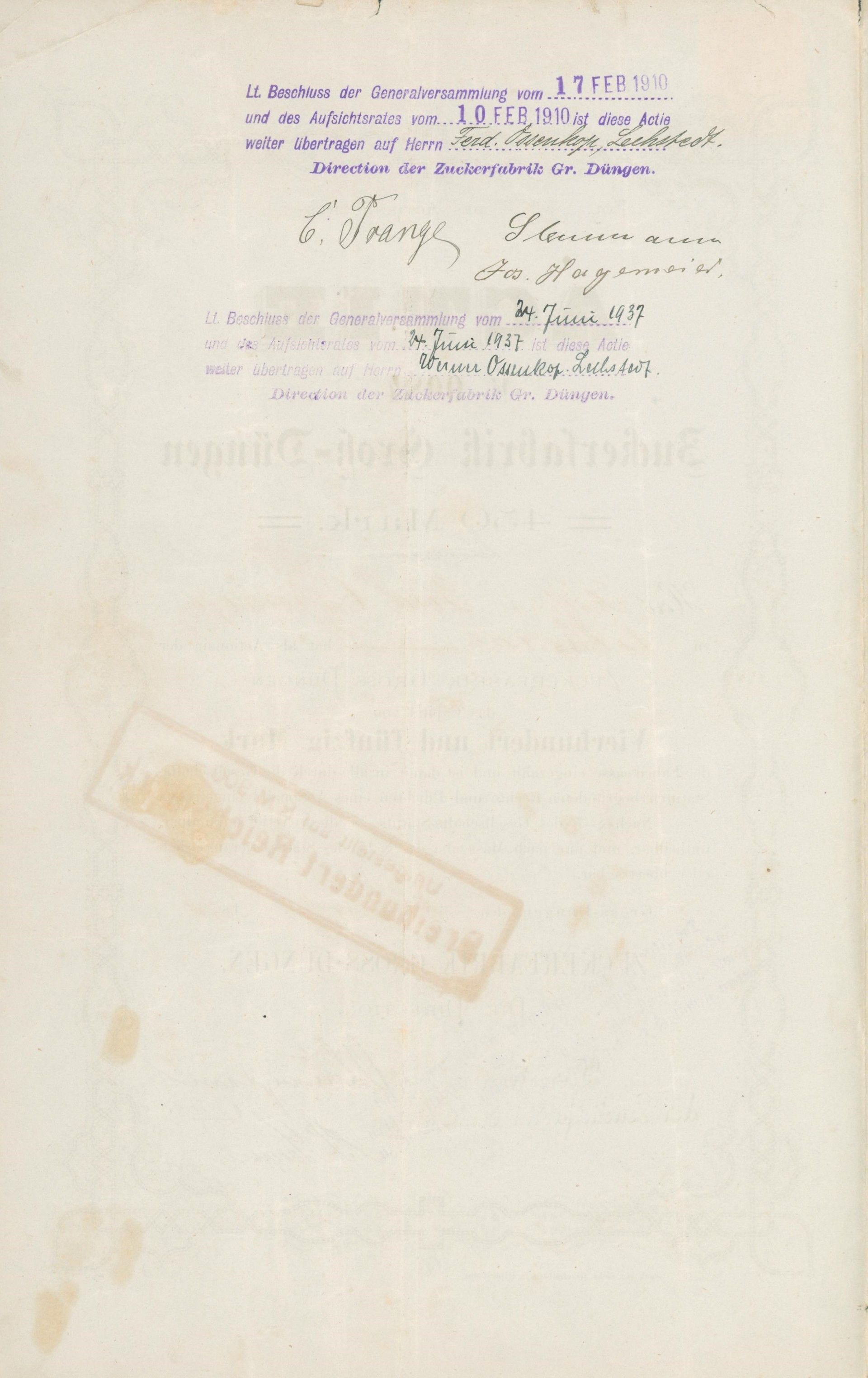 Gründeraktie. Übertragungsvermerke bis 1937. Die Aktionäre waren zum Anbau von mindestens 3/8 Hektar Zuckerrüben verpflichtet und mussten sämtliche angebauten Rüben an die Fabrik liefern.
